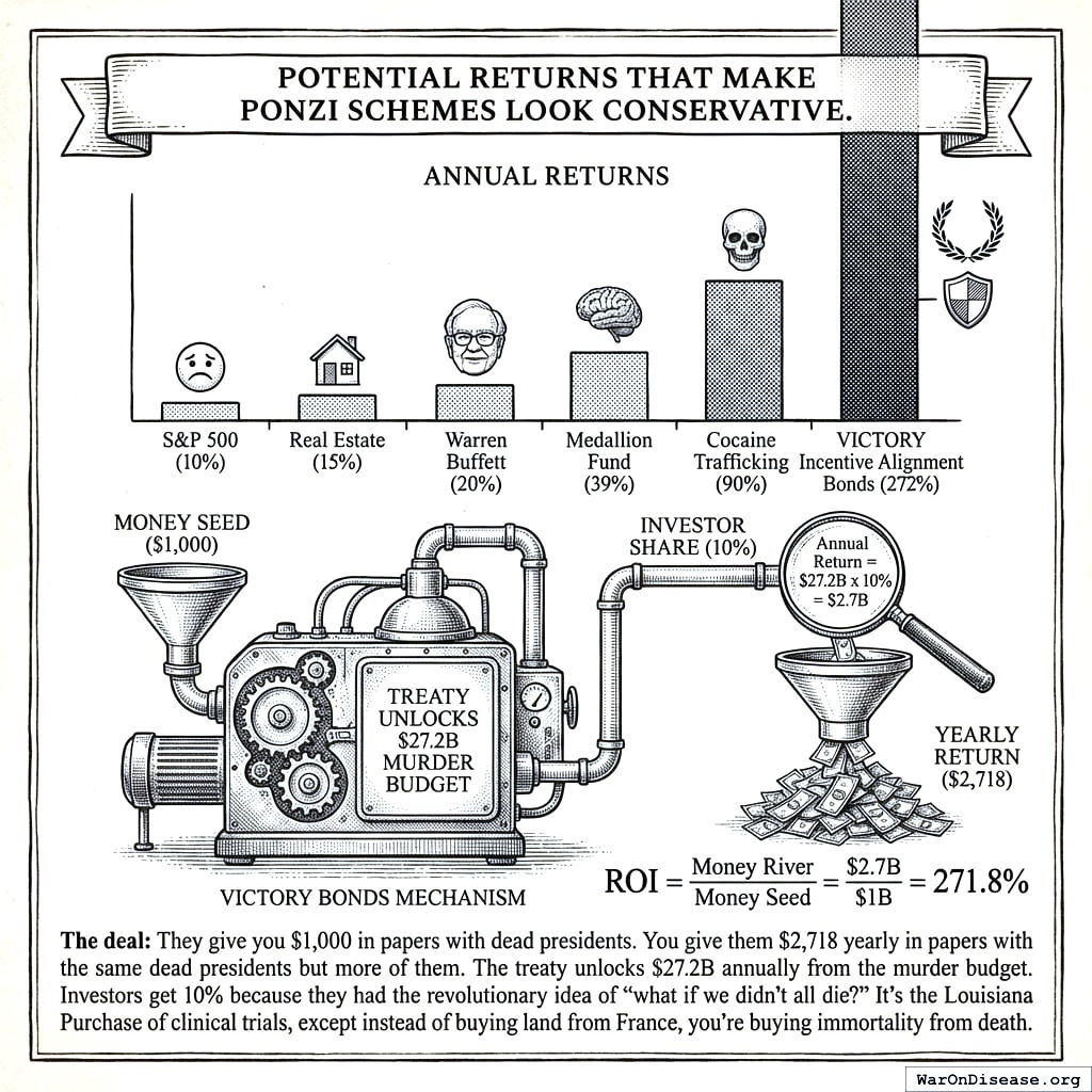 Here’s how, in three sentences: Sell Incentive Alignment Bonds141 that raise $1B to legally bribe politicians (via Super PACs and lobbying) into signing a treaty that redirects 1% of military spending to clinical trials. Of the resulting $27.2B/year, 80% funds trials, 10% pays investors 272% annual returns, and 10% funds a Super PAC that rewards politicians who voted yes. Returns grow in proportion to the treaty percentage, so every billionaire bondholder becomes a permanent lobbyist for expanding it, creating self-sustaining pressure to reallocate from death to life.