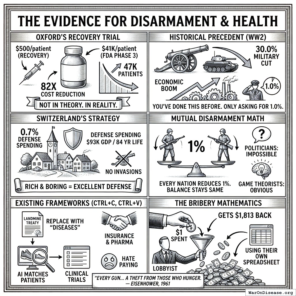 Right now, somewhere on your planet, a parent is holding a child who is dying of something curable because nobody ran the trial. The parent doesn’t know it’s curable. The doctor doesn’t know it’s curable. The compound that would save this child is sitting on a shelf, untested, because the money that would have funded the trial bought a missile that is also sitting on a shelf, unused, pointed at someone else’s children. Not because the science doesn’t exist. Not because the money doesn’t exist. $2.72T a year exists. The child is dying because every single person who could change that decided it wasn’t their problem.