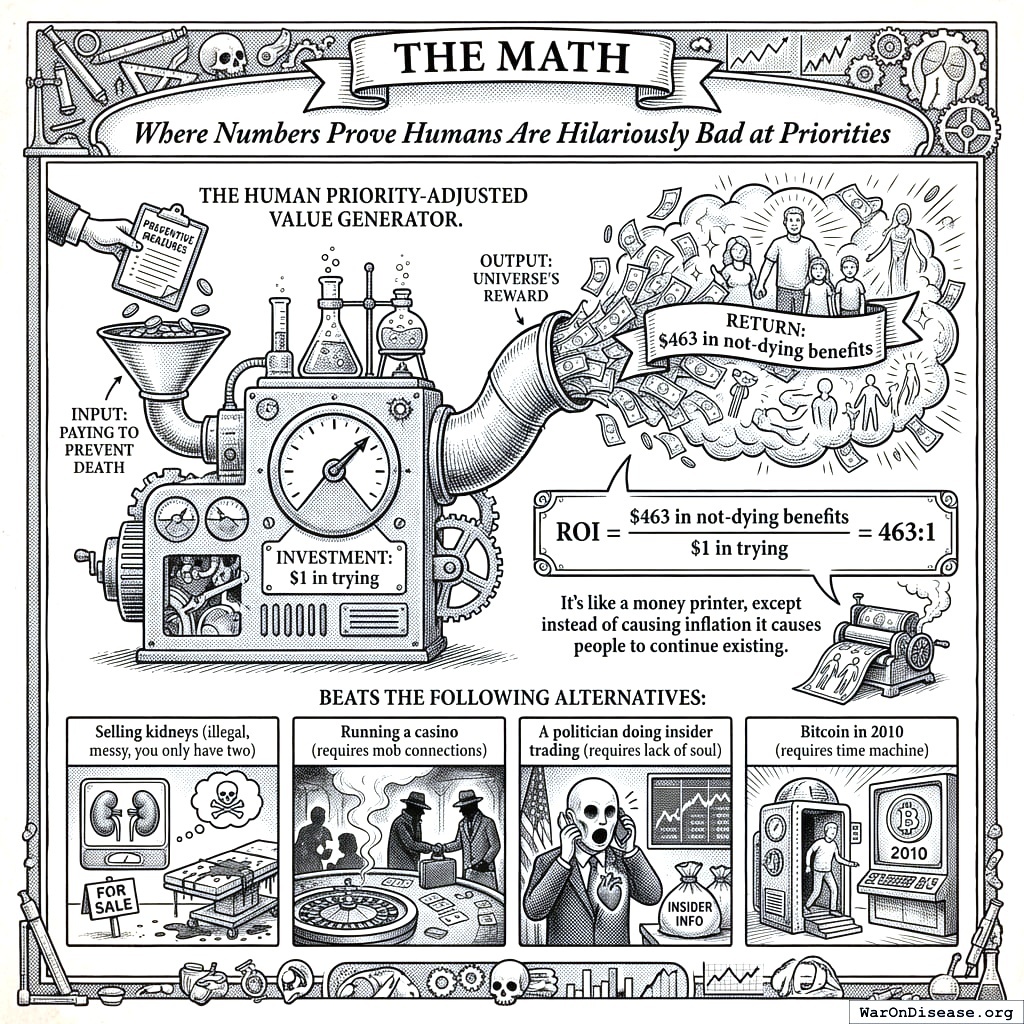 Go to warondisease.org. Vote (fifteen seconds). Get two friends to play. That’s it. Every minute you delay, 104 (95% CI: 95.4-113) humans permanently stop. Your vote saves 38.4 lives and prevents 6.9 million hours of suffering. Those are not metaphors. Those are people. They have names you’ll never learn because they died while you were deciding if this was worth fifteen seconds.