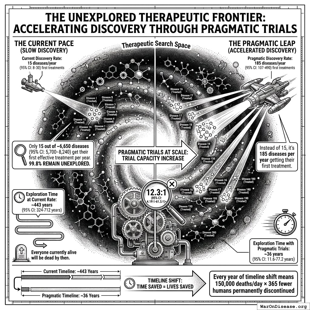 Your species spends 604 (95% CI: 453-894) times more on weapons than on testing which medicines work. Given your governments have cut military spending by 87% before and signed multiple global treaties, is it physically possible they’d redirect 1%? Would increasing clinical trial capacity by 12.3x (95% CI: 4.2x-61.4x) help find treatments faster? Would fewer sick humans save lots of money from reduced healthcare costs? Do healthy people work and produce more? Would more productive humans and lower healthcare costs compound and give everyone more money over time? Do billionaires like money? Do billionaires prefer not dying of horrible diseases? Can billionaires use money to make politicians do things? Would nearly every human be better off in a world with less war and disease? Do humans like to be better off? If there was a plan that cost $1 billion to achieve all of this, is it possible one of your 2.78 thousand billionaires might do it?