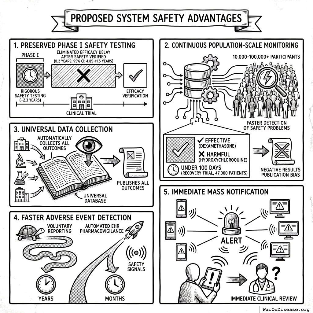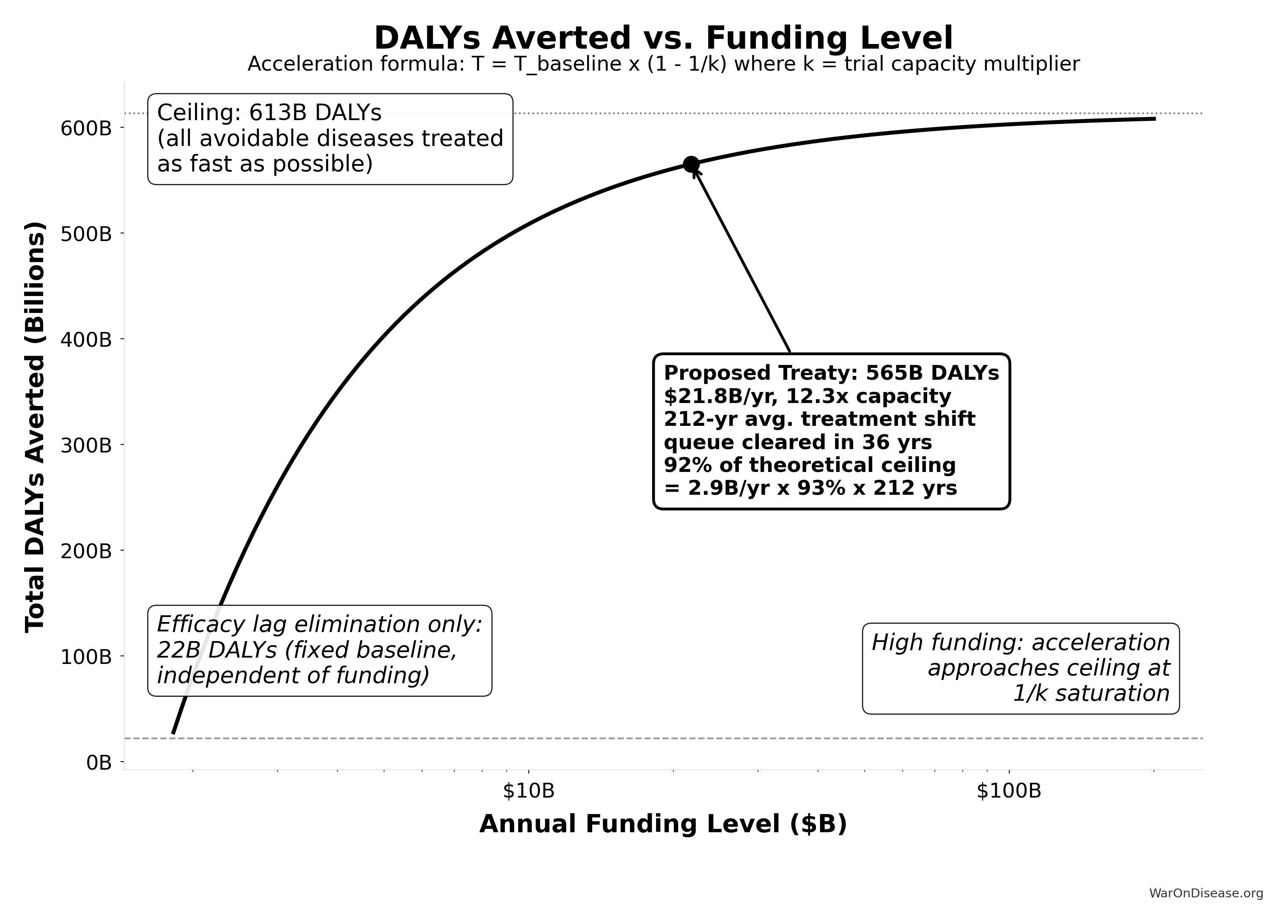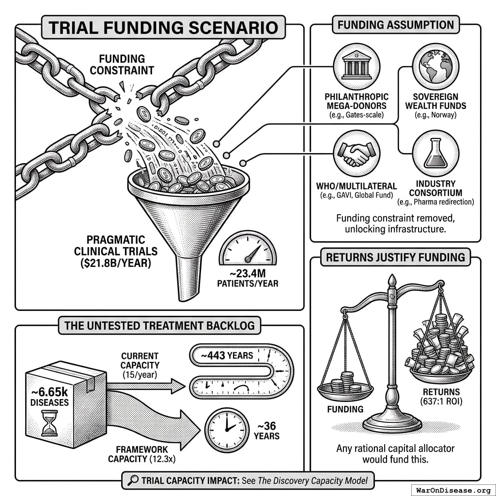 How the 12.3x (95% CI: 4.2x-61.4x) capacity increase works: With $21.8B/year in trial funding at $929 (95% CI: $97-$3K)/patient (based on ADAPTABLE trial), the framework enables 23.4 million patients/year (95% CI: 9.46 million patients/year-97 million patients/year) annual trial participants vs. current 1.9 million patients/year (95% CI: 1.5 million patients/year-2.3 million patients/year), increasing trial completion rate from 15 diseases/year (95% CI: 8 diseases/year-30 diseases/year) to 185 diseases/year (95% CI: 107 diseases/year-491 diseases/year). This removes the primary bottleneck to medical progress: currently less than 0.06% of willing patients can access trials, and over 9.5 thousand compounds (95% CI: 7 thousand compounds-12 thousand compounds) proven-safe (FDA-approved drugs + GRAS substances) remain untested for most conditions they could improve.