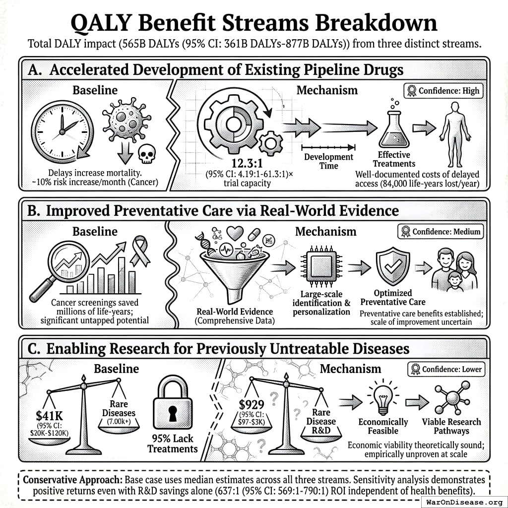 4. Historical Precedent: Smallpox eradication (280:1 ROI) and childhood vaccination programs demonstrate that systematic health interventions can achieve extraordinary returns. The difference: those targeted specific diseases. This targets the discovery process itself, potentially even higher leverage.