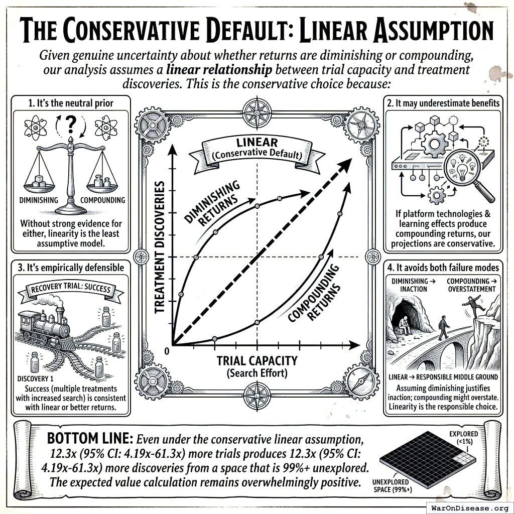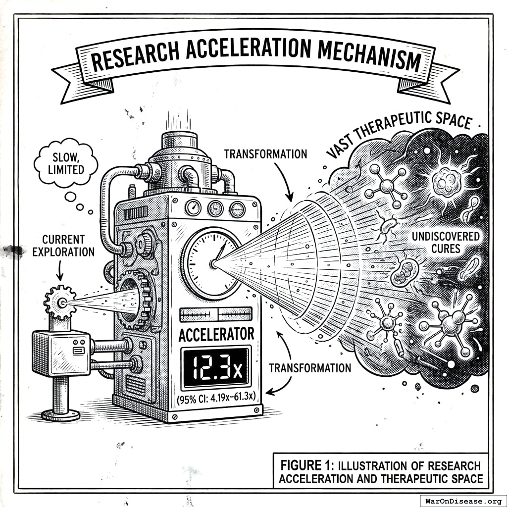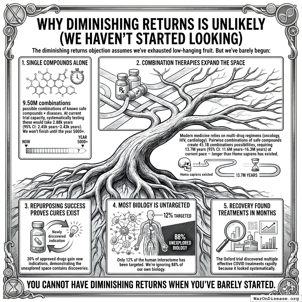 Interpreting the Timeline Figure: The 212 years (95% CI: 135 years-355 years) figure represents a discovery capacity model of medical research. Think of the therapeutic search space as the set of all untested drug-disease combinations, with trial capacity determining how fast we can explore it.