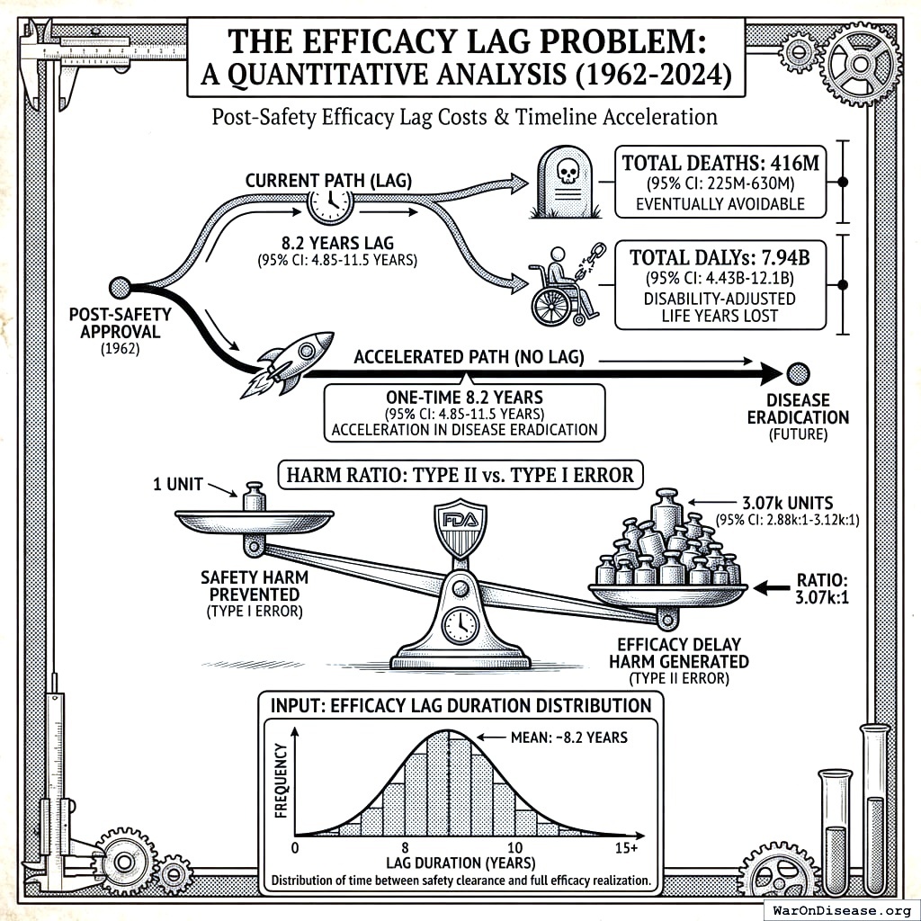 2. Efficacy lag elimination (8.2 years (95% CI: 4.85 years-11.5 years)): Once discovered, treatments reach patients immediately instead of waiting for Phase II/III