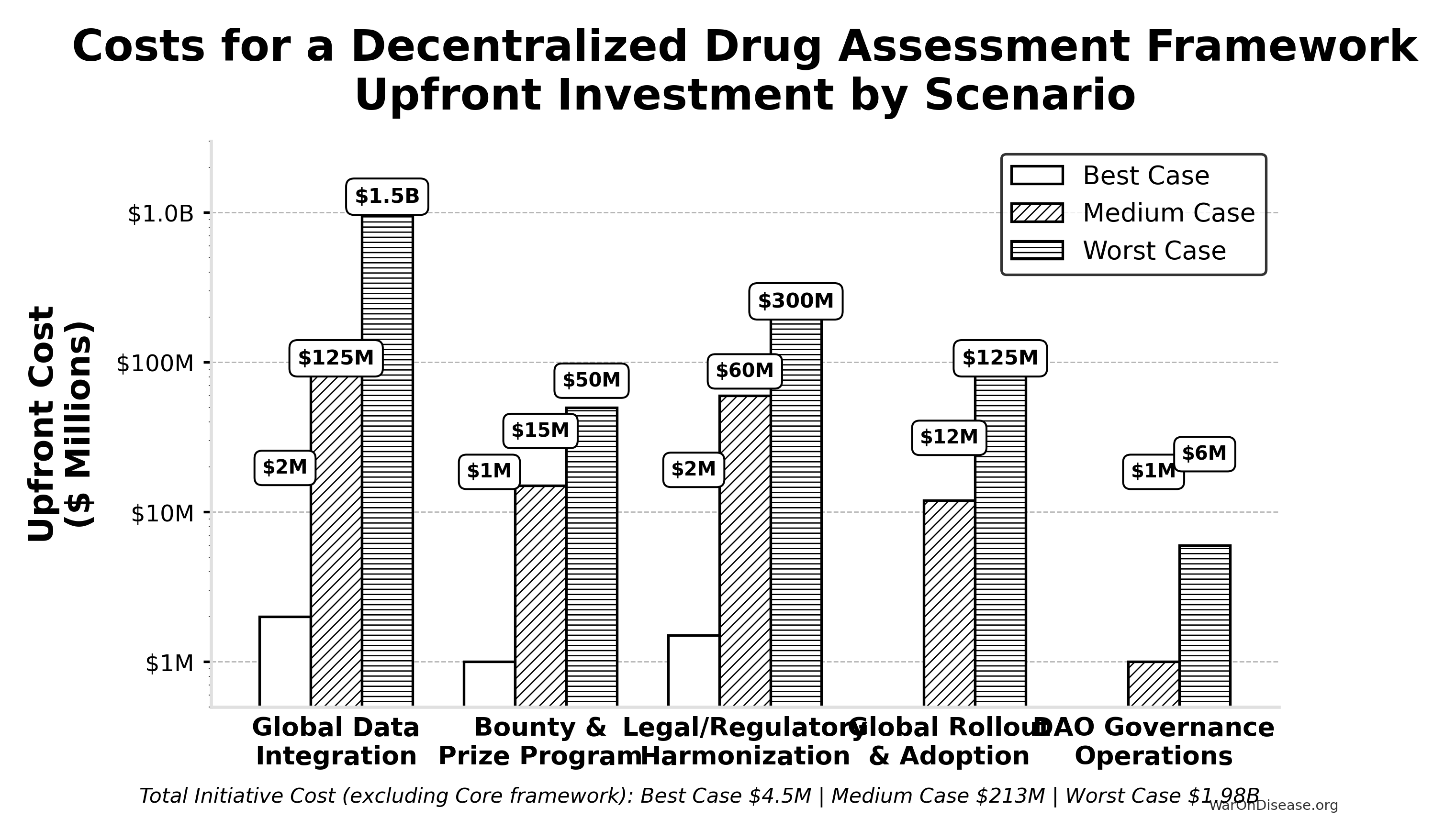 \[ \begin{gathered} OPEX_{dFDA} \\ = Cost_{platform} + Cost_{staff} + Cost_{infra} \\ + Cost_{regulatory} + Cost_{community} \\ = \$15M + \$10M + \$8M + \$5M + \$2M \\ = \$40M \end{gathered} \]