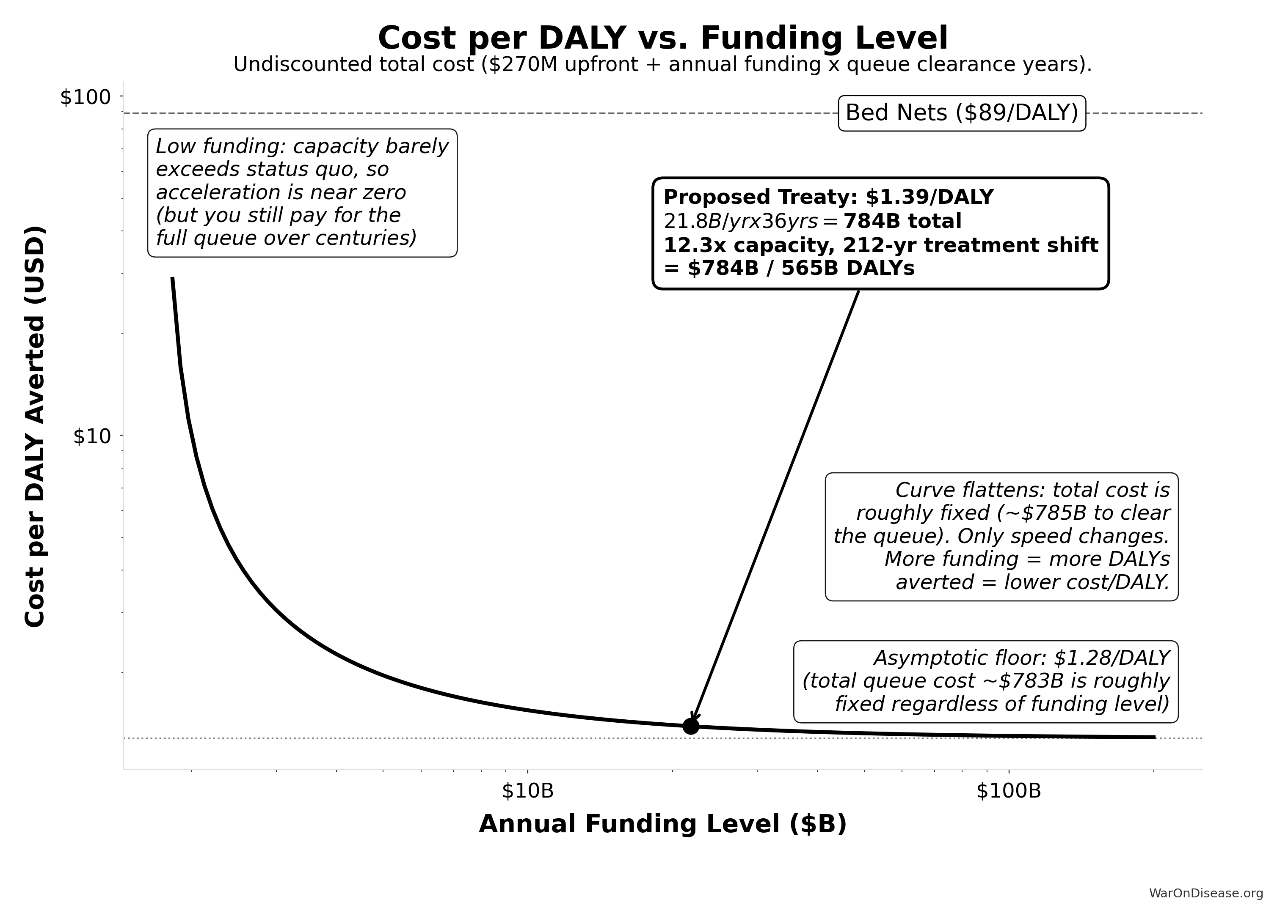 \[ \begin{gathered} Cost_{direct,DALY} \\ = \frac{NPV_{direct}}{DALYs_{max}} \\ = \frac{\$476B}{565B} \\ = \$0.842 \end{gathered} \]
