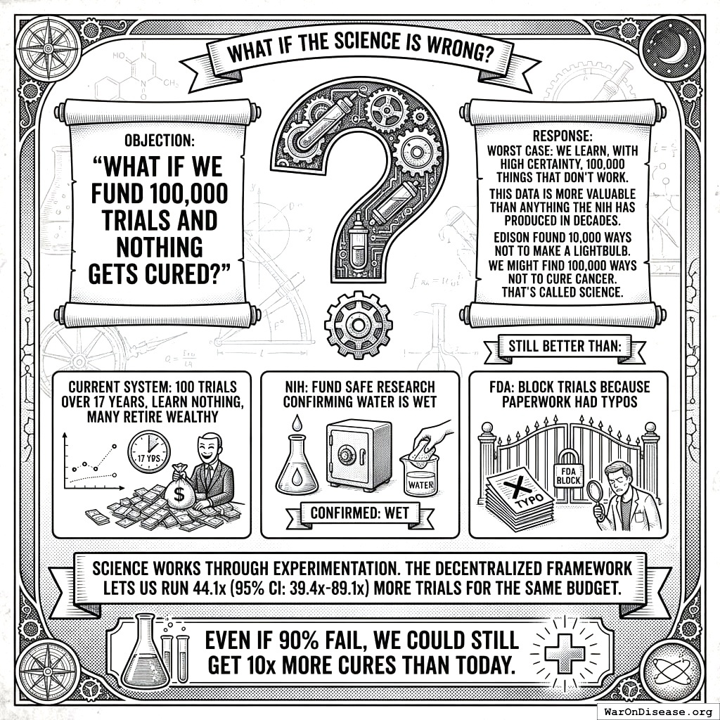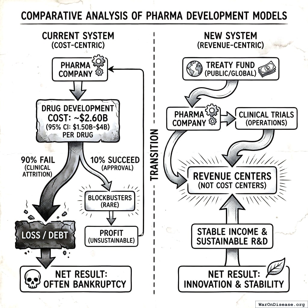 Pharma currently pays $2.6B (95% CI: $1.5B-$4B) per drug. 90% fail. This is called “drug development.” On Wishonia, we have a different word for spending billions with a 10% success rate. We call it “gambling.”