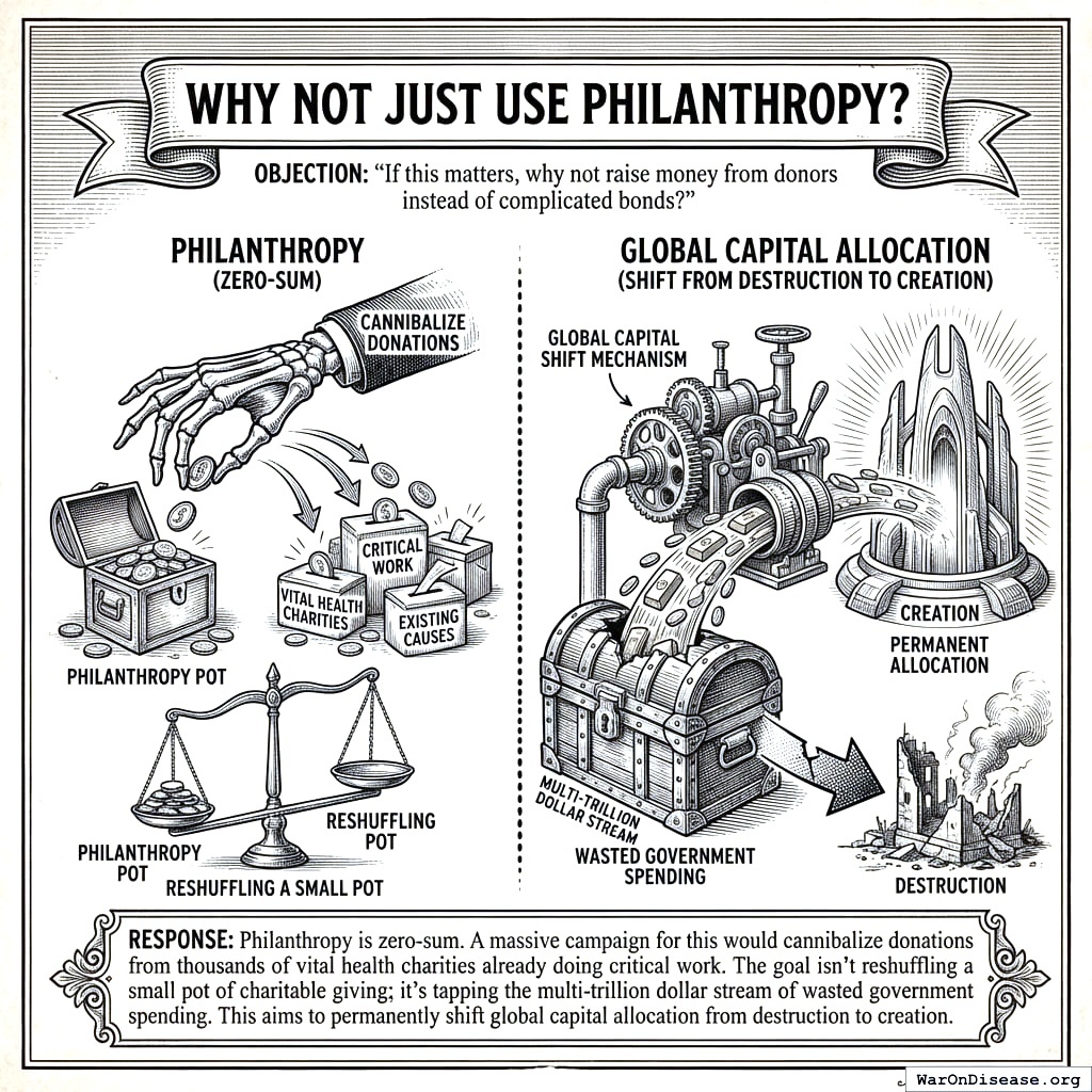 10.5281/zenodo.18161560 6.65 thousand diseases have zero FDA-approved treatments; at current trial capacity, exploring them takes 443 years. Redirecting 1% of military spending scales capacity 12.3x, cutting the timeline to 36 years and preventing 10.7 billion deaths. At $0.00177/DALY, 50.3kx more cost-effective than the best existing interventions. Incentive Alignment Bonds make adoption politically viable.