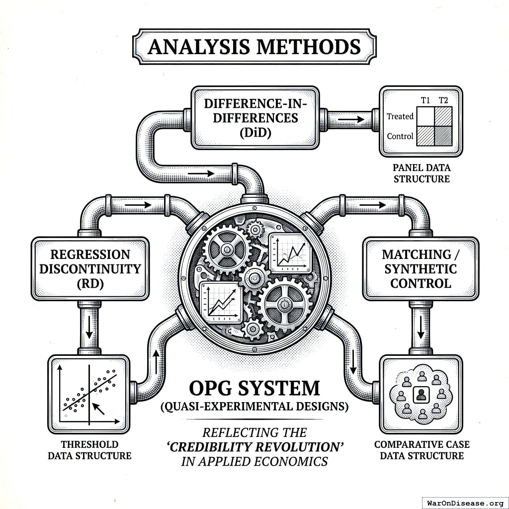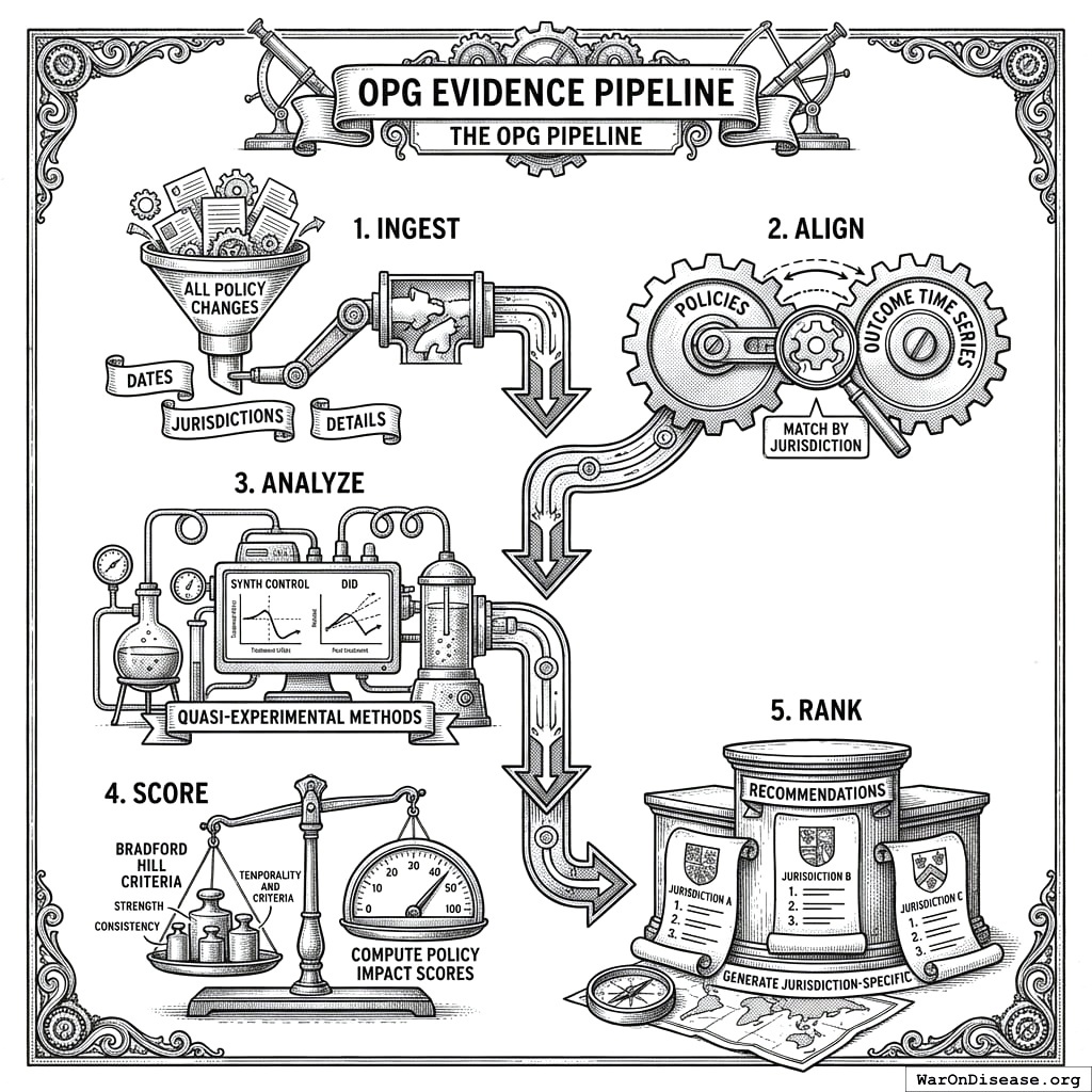 The Optimal Policy Generator (OPG) applies causal inference methods (synthetic control, difference-in-differences, regression discontinuity) and Bradford Hill criteria to this cross-jurisdictional data, measuring policy impact on two welfare metrics: real after-tax median income growth and median healthy life years.