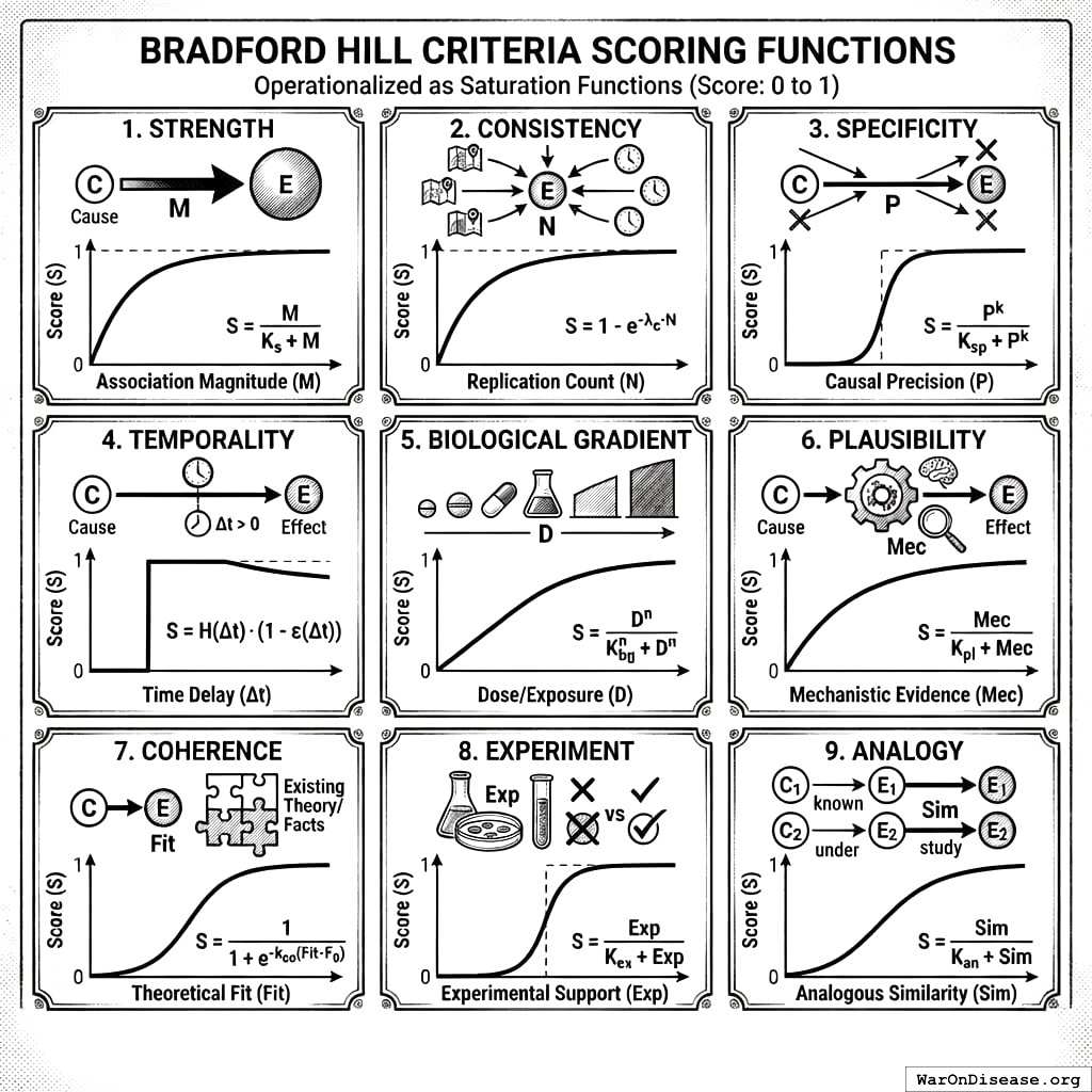 Bradford Hill criteria: Strength, Consistency, Temporality, Gradient, Experiment, Plausibility, Coherence, Analogy, Specificity. See Bradford Hill Criteria Scoring Functions.