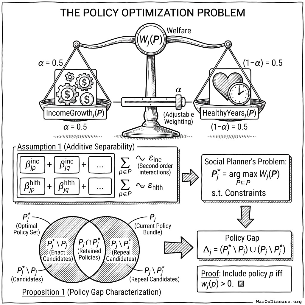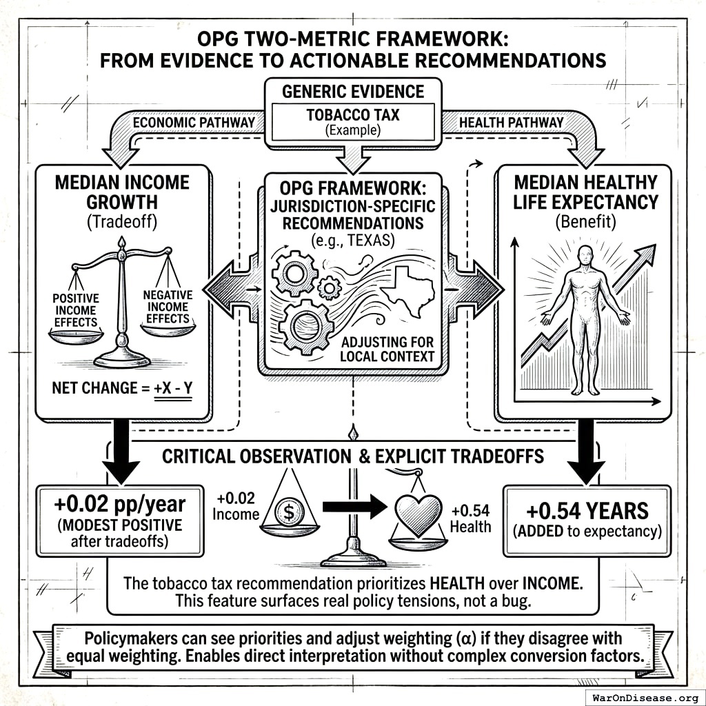 The framework does not hide this tradeoff by claiming healthcare cost savings are “income gains.” If a policy improves health but costs money, both effects are reported honestly. This is a feature, not a bug: it prevents corner solutions (an infinite tobacco tax would maximize health but devastate income for smokers) and surfaces the welfare tradeoff for democratic deliberation.