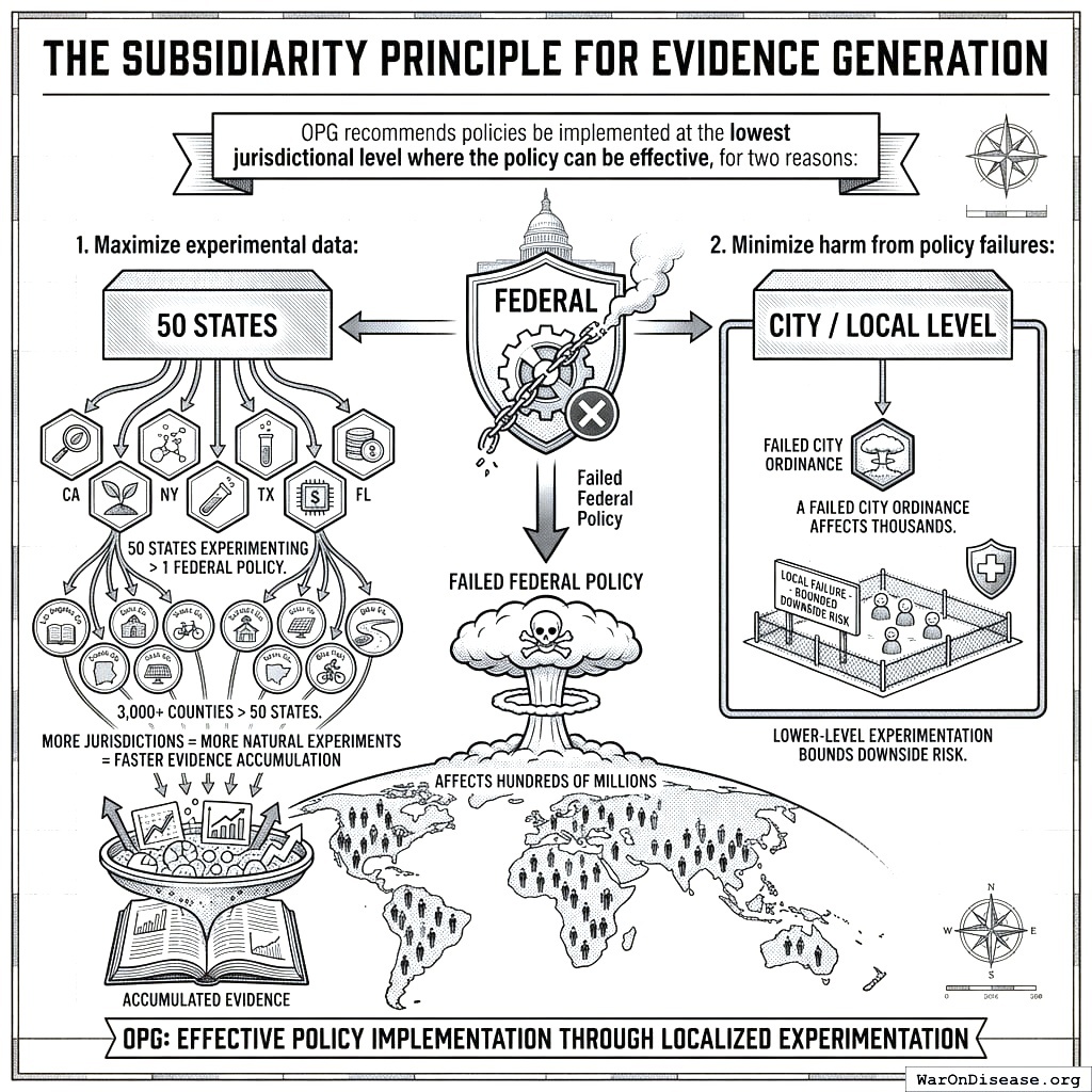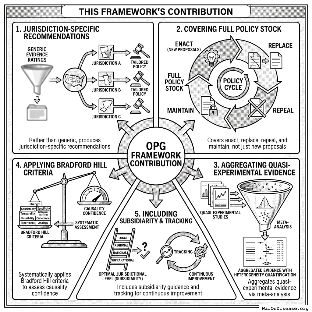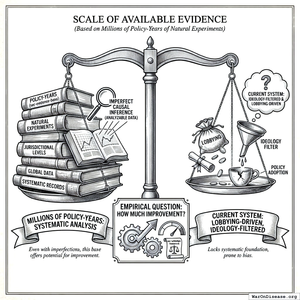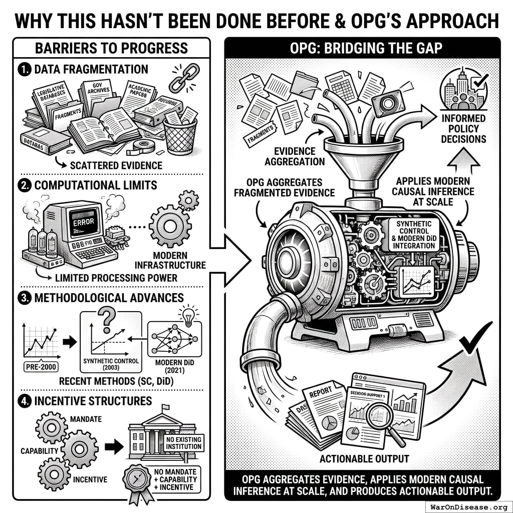 Every jurisdiction that enacted a policy created a natural experiment. The evidence to know what works already exists, scattered across thousands of jurisdictions and hundreds of years. OPG systematically harvests this evidence.