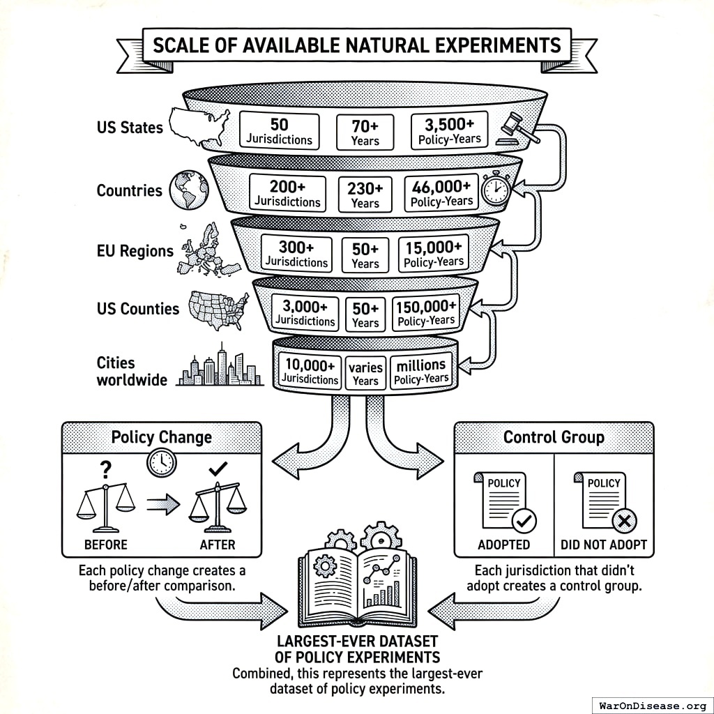 Each policy change creates a before/after comparison. Each jurisdiction that didn’t adopt creates a control group. This represents a vast, largely untapped evidence base.