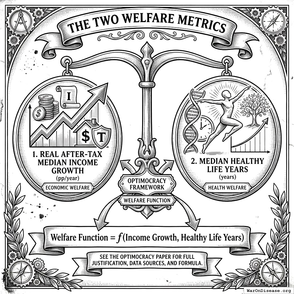 See the Optimocracy paper for full justification of these metric choices, data sources, and the welfare function formula.