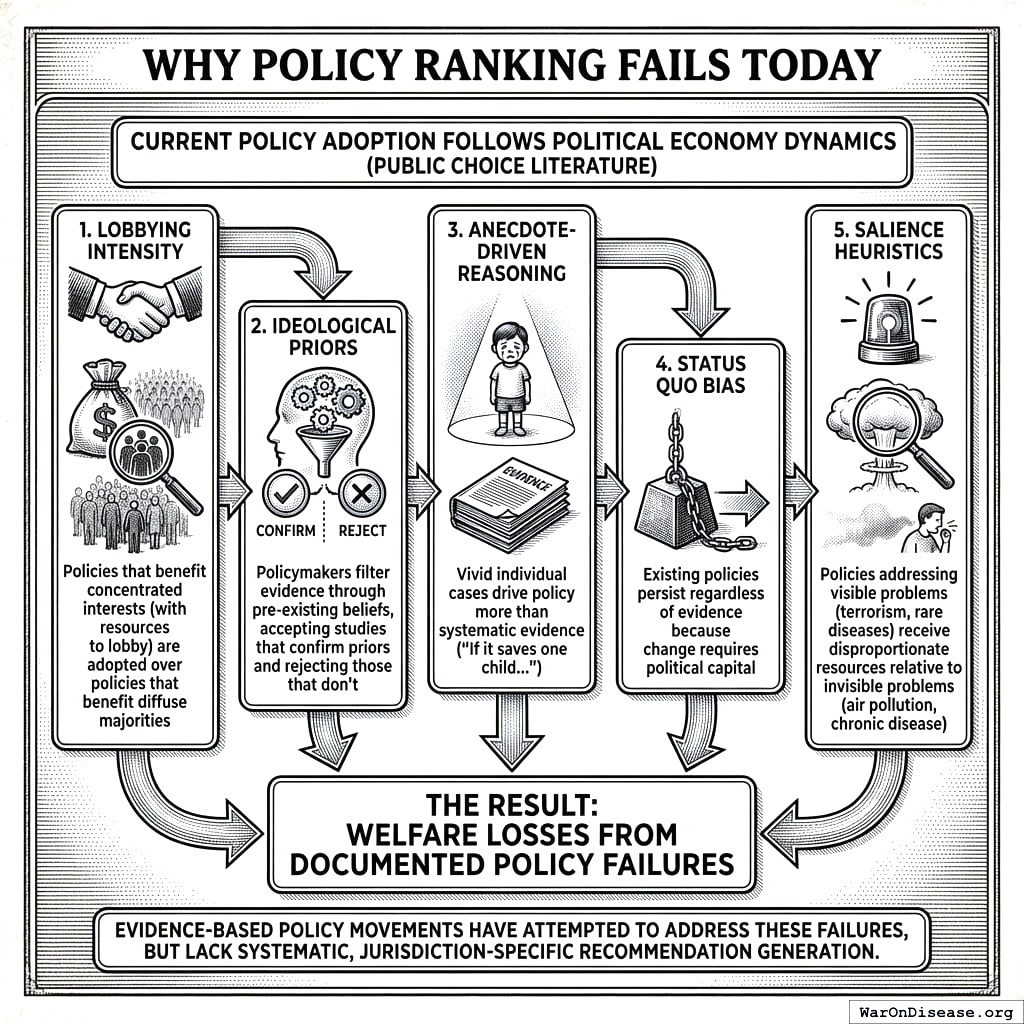 Scale note. If recommendation quality is the bottleneck, the upside from fixing it is enormous. Under the project’s best-case governance ceiling, the recoverable upside is $101T (95% CI: $83.3T-$191T) per year. Over 20 years, the Wishonian Optimal Governance Trajectory reaches 56.7x (95% CI: 19.3x-304x) the Earth baseline, raises average income to $1.16M (95% CI: $395K-$6.22M) versus $20.5K on the status-quo path, and reaches $10.7 quadrillion (95% CI: $3.64 quadrillion-$57.2 quadrillion) in total output. This specification focuses on the policy-selection layer of that plan; the full derivation lives in The Political Dysfunction Tax48.