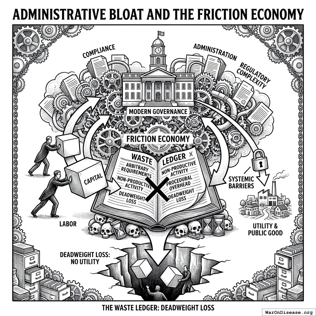 Modern governance has spawned a “Friction Economy,” a vast sector of activity dedicated solely to compliance, administration, and the management of regulatory complexity. In the Waste Ledger, these costs are treated as deadweight loss: labor and capital that produce no utility other than satisfying the arbitrary requirements of the system itself.