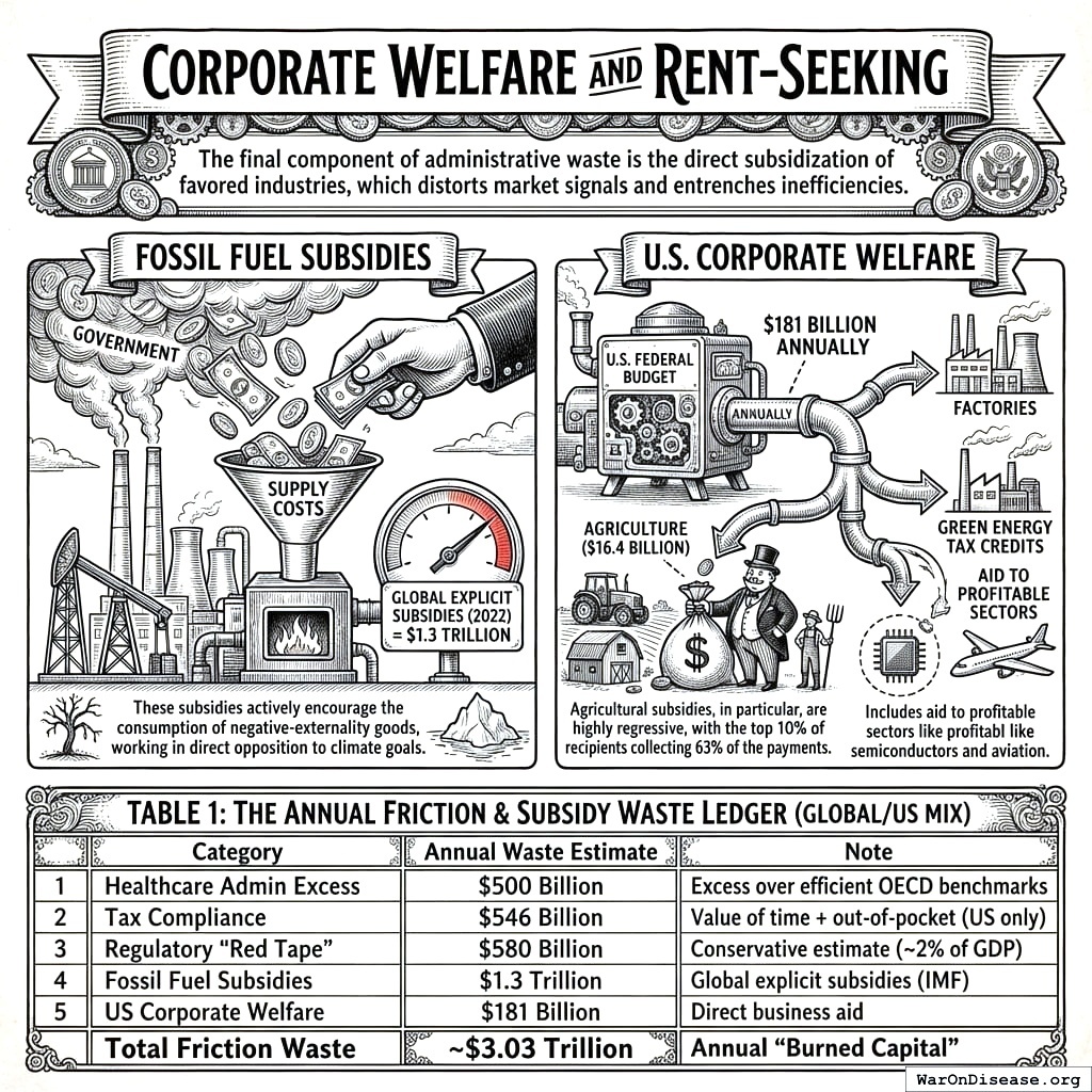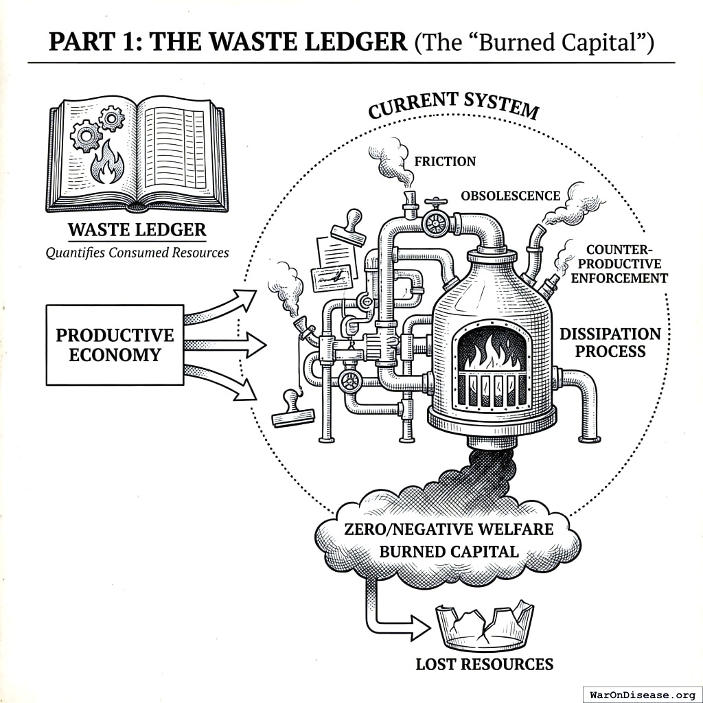 The Waste Ledger quantifies the resources that are actively consumed by the current system to produce zero or negative welfare. These are not merely neutral transfers; they represent capital extracted from the productive economy and dissipated through friction, obsolescence, and counter-productive enforcement.