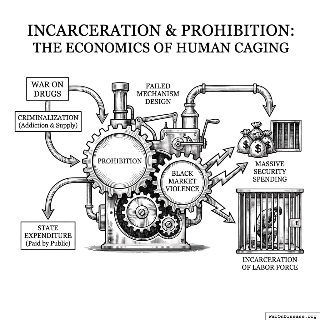 The “War on Drugs” represents a catastrophic failure of mechanism design. By criminalizing addiction and supply, the state creates a black market that fuels violence (requiring massive security spending) while simultaneously paying to incarcerate its own labor force.