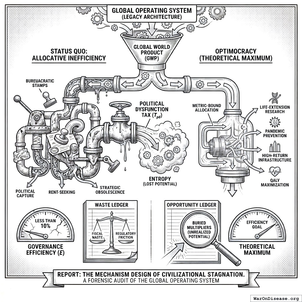 Our central hypothesis posits that current governance operates at less than 10% of its theoretical efficiency. To test this, we contrast the Status Quo against a theoretical maximum denoted as “Optimocracy” (or Optimal Governance). In an Optimocracy, resource allocation is outcome-optimizing: capital flows are determined by their ability to maximize Quality-Adjusted Life Years (QALYs) and long-term economic growth, unencumbered by the principal-agent problems that define contemporary politics. This audit rigorously quantifies two distinct ledgers: the Waste Ledger, tracking the direct incineration of capital through inefficiency; and the Opportunity Ledger, measuring the “buried multipliers” of unrealized scientific and human potential.
