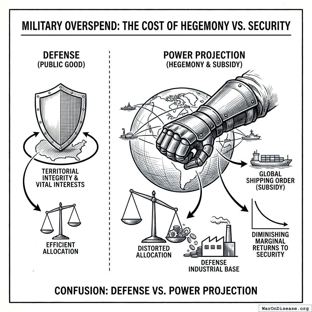 The most glaring allocative distortion in the global public sector is the confusion between “defense” (the protection of territorial integrity and vital interests) and “power projection” (the maintenance of global hegemony through forward presence). While the former is a public good, the latter operates as a massive, unpriced subsidy to the global shipping order and a stimulus program for the defense industrial base, often with diminishing marginal returns to actual security.