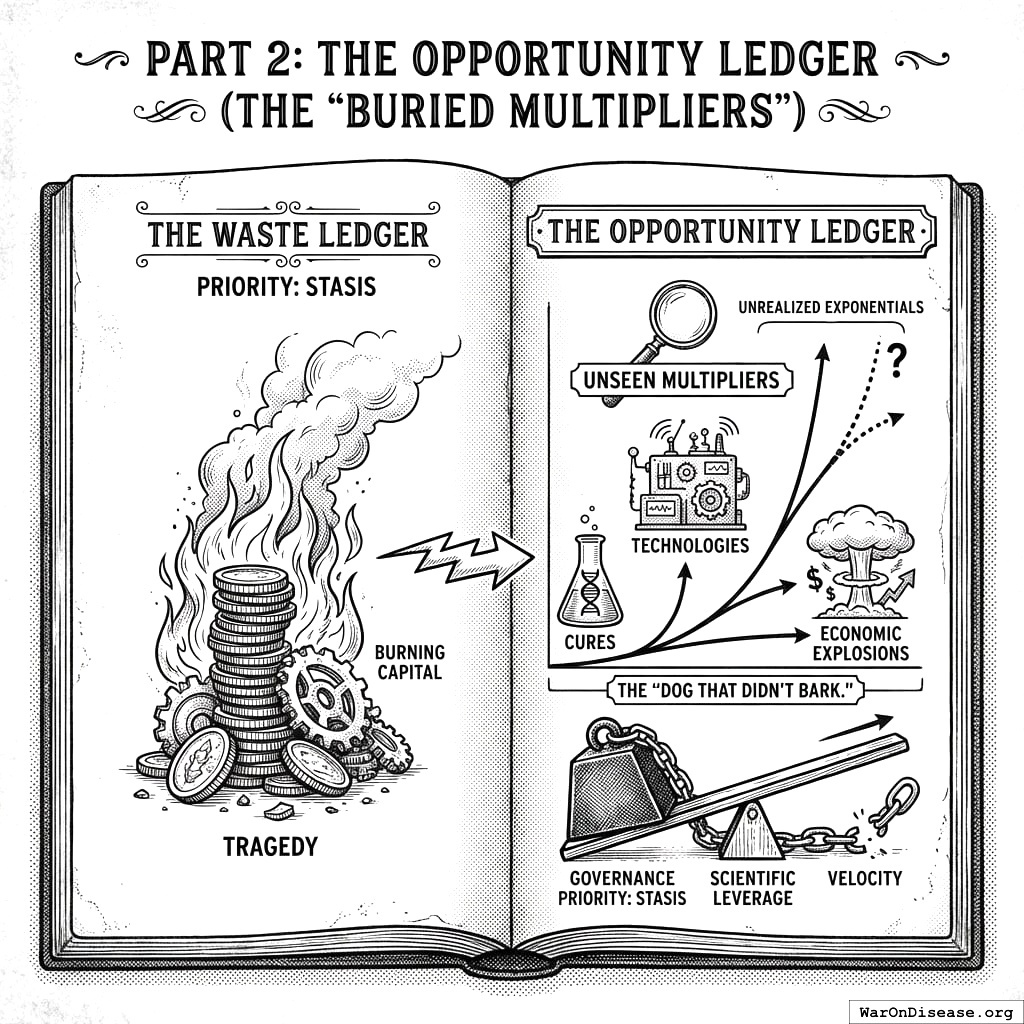 If the Waste Ledger is a tragedy of burning capital, the Opportunity Ledger is a tragedy of unrealized exponentials. This ledger attempts to price the “dog that didn’t bark,” the cures, technologies, and economic explosions that would exist if governance prioritized velocity and scientific leverage over stasis.