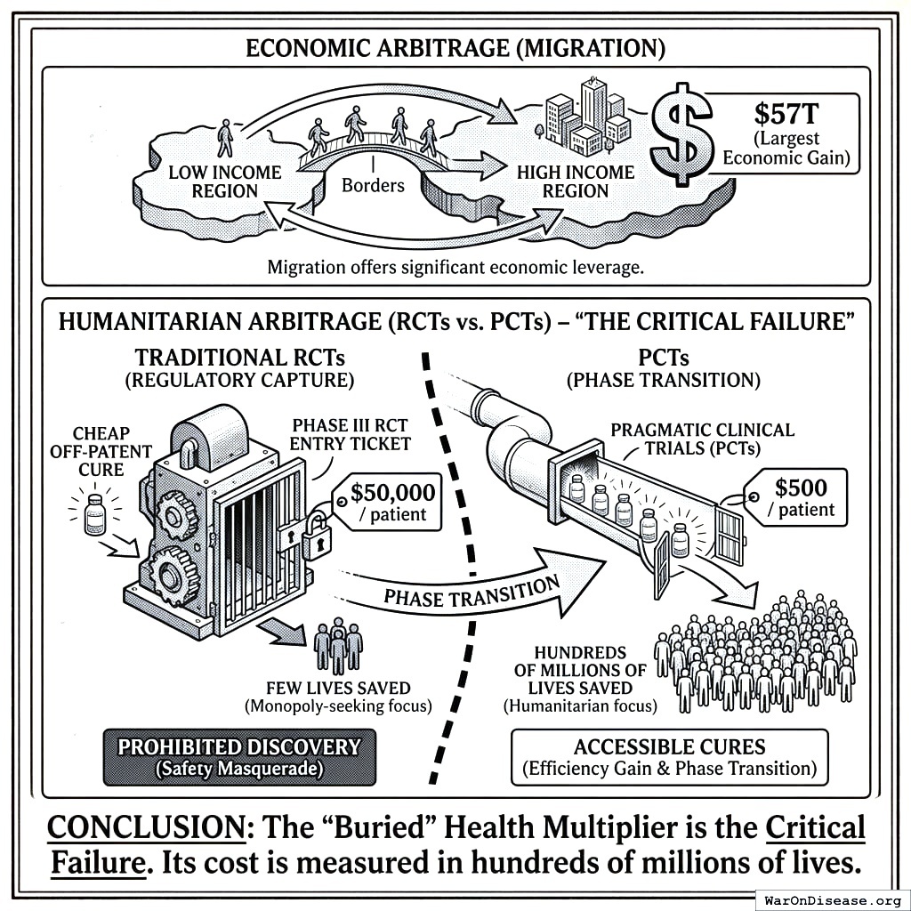 While Migration offers the largest economic arbitrage ($57T), the shift from RCTs to PCTs represents the largest humanitarian arbitrage. The difference between $50,000/patient and $500/patient is not just an efficiency gain; it is a phase transition. The current regulatory state effectively prohibits the discovery of cheap, off-patent cures because the “entry ticket” (Phase III RCT) is too expensive for any entity other than a monopoly-seeking pharmaceutical giant. This is a regulatory capture mechanism masquerading as safety, and its cost is measured in hundreds of millions of lives.