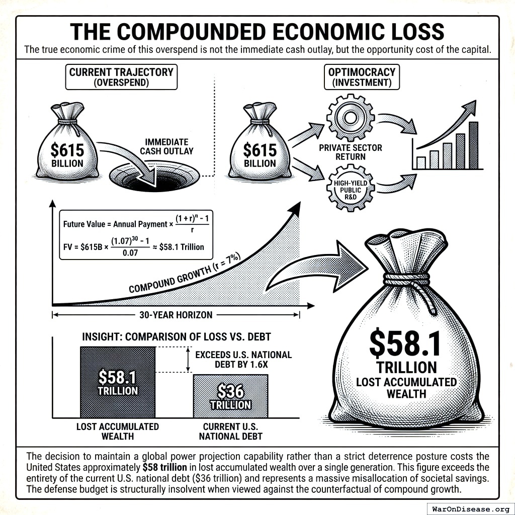 Insight: The decision to maintain a global power projection capability rather than a strict deterrence posture costs the United States approximately $58 trillion in lost accumulated wealth over a single generation. This figure exceeds the entirety of the current U.S. national debt ($36 trillion)156 and represents a massive misallocation of societal savings. The defense budget is structurally insolvent when viewed against the counterfactual of compound growth.
