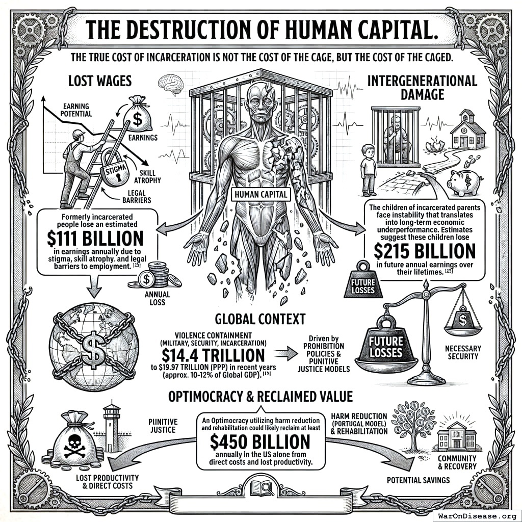 The global cost of containing violence (including military, internal security, and incarceration) was estimated at $14.4 trillion to $19.97 trillion (PPP) in recent years, or roughly 10-12% of Global GDP167. While some security is necessary, the “excess” spending driven by prohibition policies and punitive justice models represents trillions in potential savings. An Optimocracy that utilized harm reduction (the Portugal model) and rehabilitation could likely reclaim at least $450 billion annually in the US alone from direct costs and lost productivity.