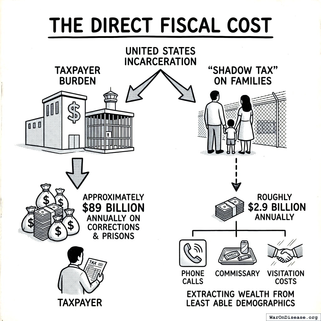 The United States, with one of the highest incarceration rates in the world, spends approximately $89 billion annually on corrections and prisons165. Beyond the taxpayer, families of the incarcerated pay a “Shadow Tax” of roughly $2.9 billion annually for phone calls, commissary, and visitation costs166, extracting wealth from the demographics least able to afford it.