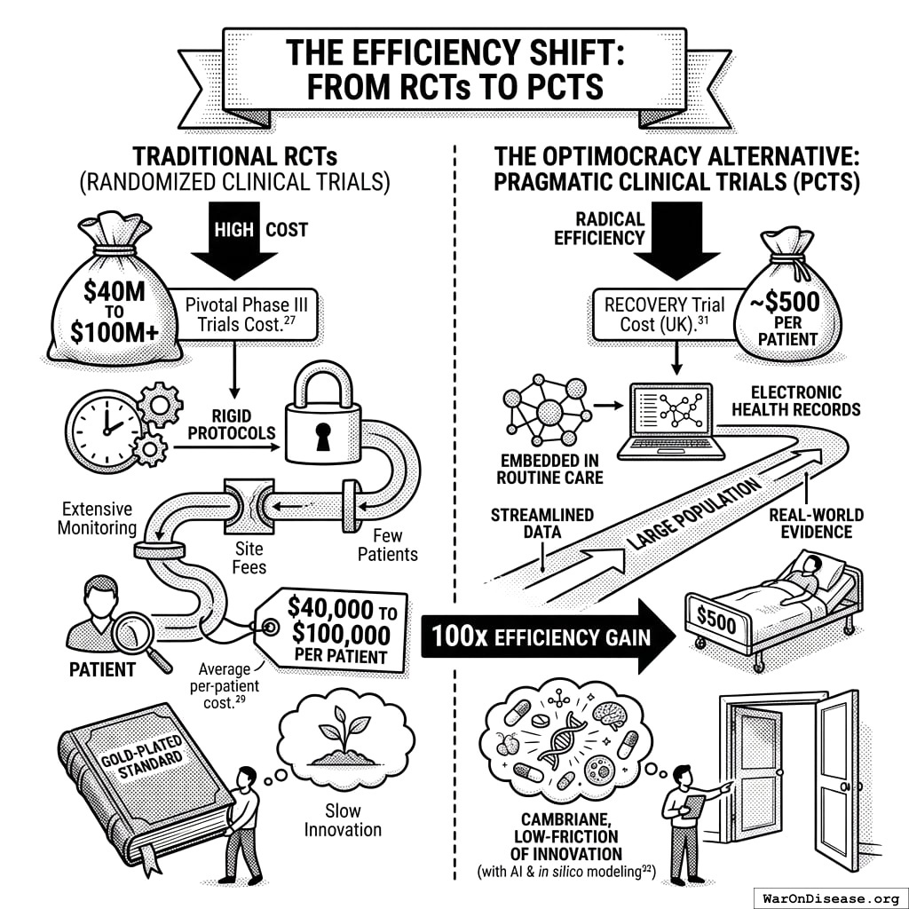 The Optimocracy Alternative: Pragmatic Clinical Trials (PCTs), which are embedded in routine clinical care and utilize electronic health records for data collection, offer a path to radical efficiency.