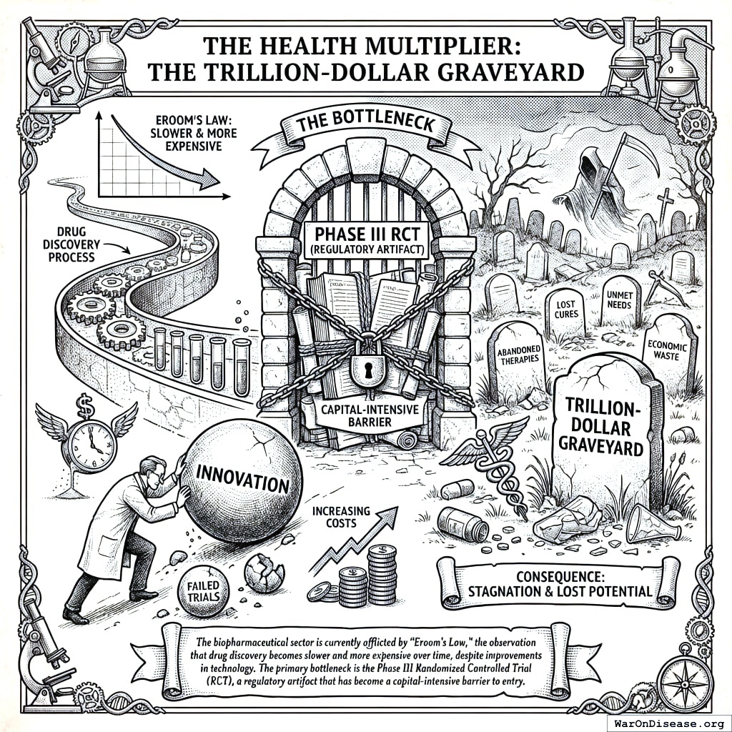The biopharmaceutical sector is currently afflicted by “Eroom’s Law,” the observation that drug discovery becomes slower and more expensive over time, despite improvements in technology. The primary bottleneck is the Phase III Randomized Controlled Trial (RCT), a regulatory artifact that has become a capital-intensive barrier to entry.