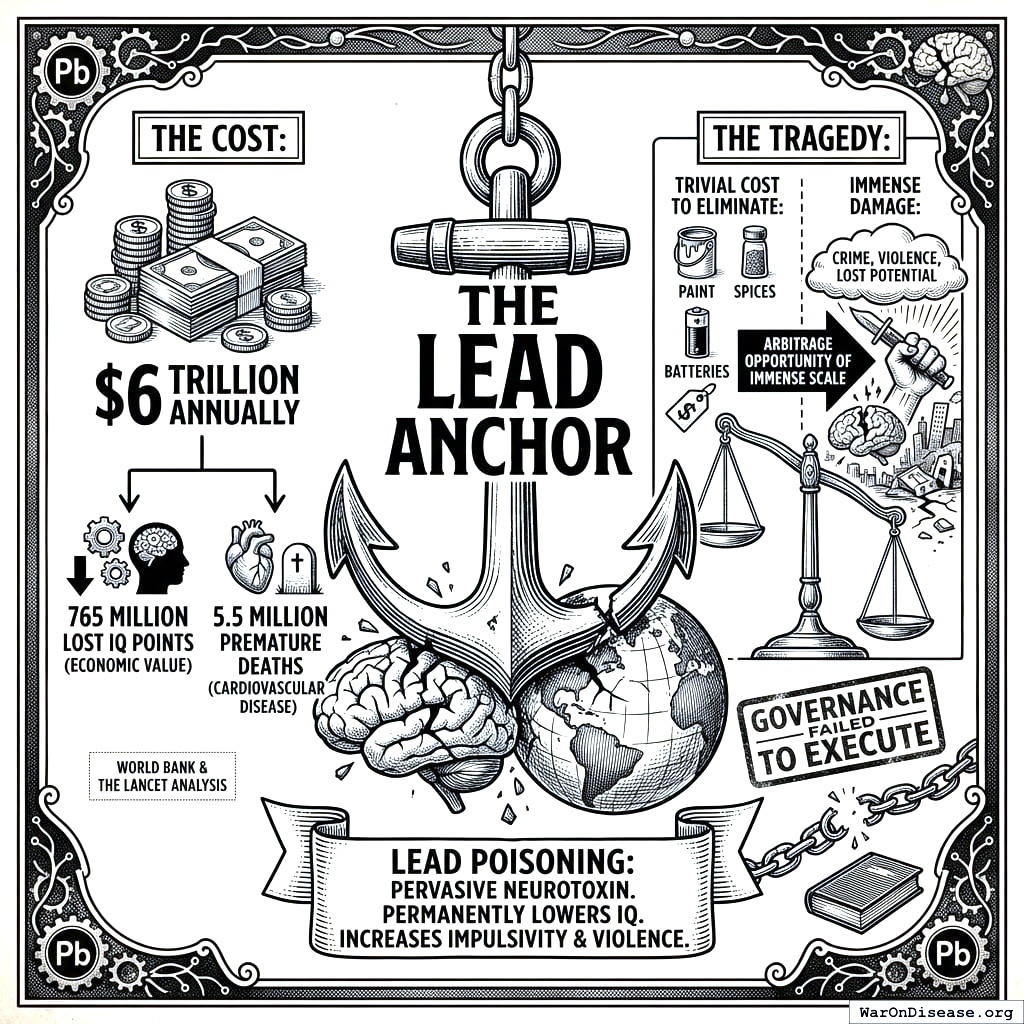 • The Tragedy: The cost to eliminate lead from paint, spices, and batteries is trivial compared to the damage. This is an arbitrage opportunity of immense scale that governance has failed to execute.