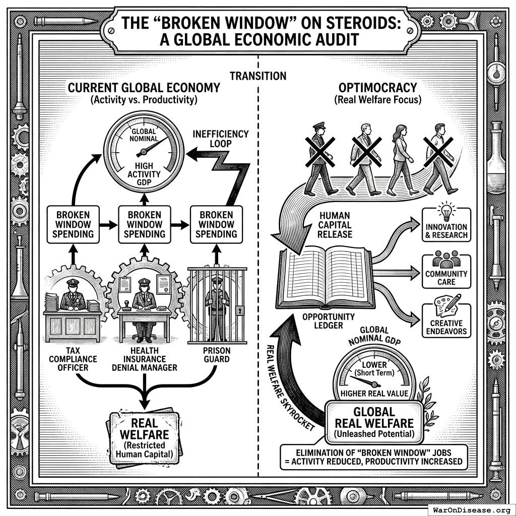The audit reveals that a significant percentage of Global GDP is effectively “Broken Window” spending. We count the salary of the tax compliance officer, the health insurance denial manager, and the prison guard as “production.” In an Optimocracy, these jobs do not exist. Their elimination would reduce nominal GDP in the short term but would skyrocket real welfare by releasing human capital into the Opportunity Ledger. The current system mistakes activity for productivity.
