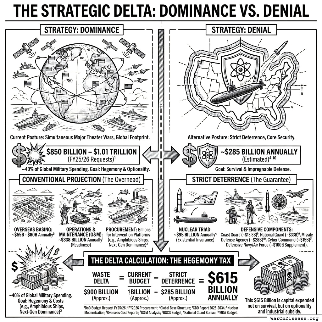 The United States spends nearly $1 trillion on defense, yet the “Strict Deterrence” audit demonstrates that existential safety could be purchased for roughly $300 billion. The remaining $700 billion is not buying safety; it is buying influence and industrial subsidy. From a Welfare Economics perspective, this is a massive malinvestment.