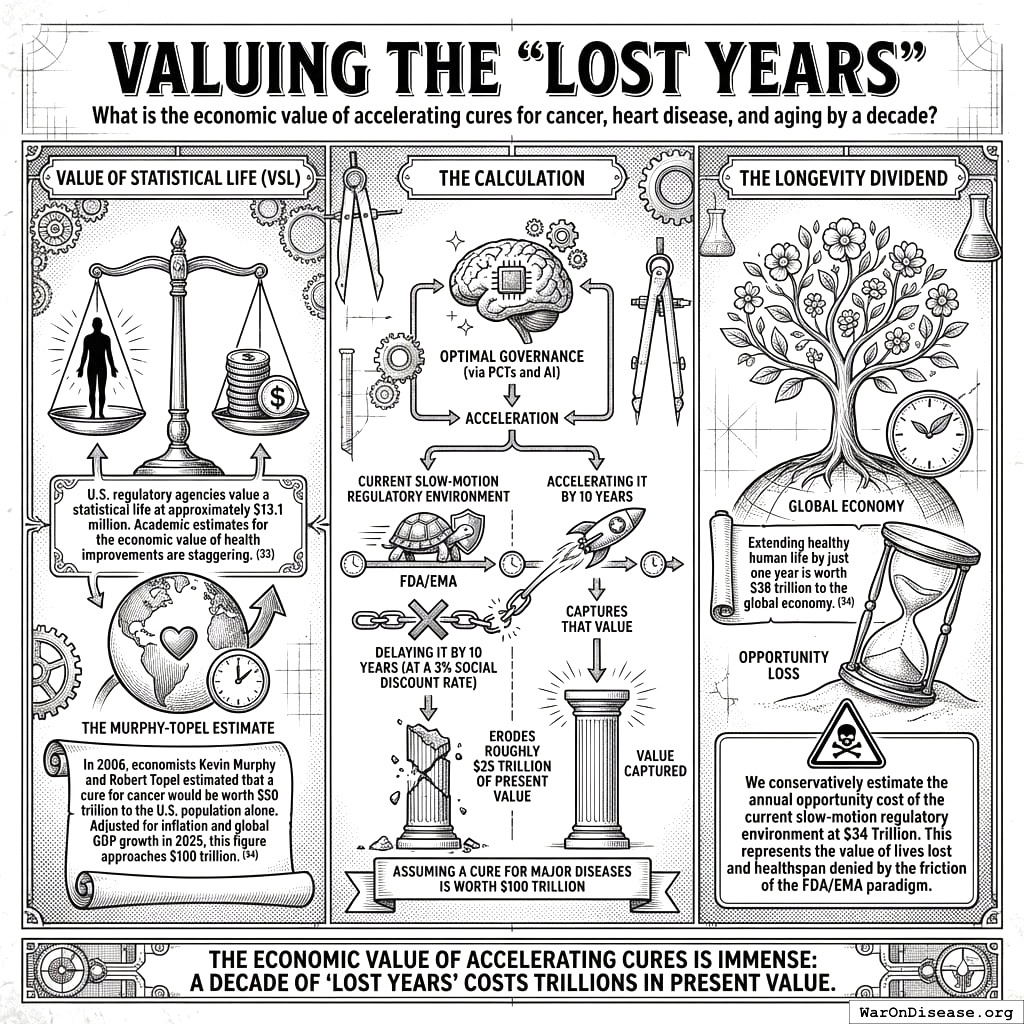 Opportunity Loss: We conservatively estimate the annual opportunity cost of the current slow-motion regulatory environment at $34 Trillion. This represents the value of lives lost and healthspan denied by the friction of the FDA/EMA paradigm.
