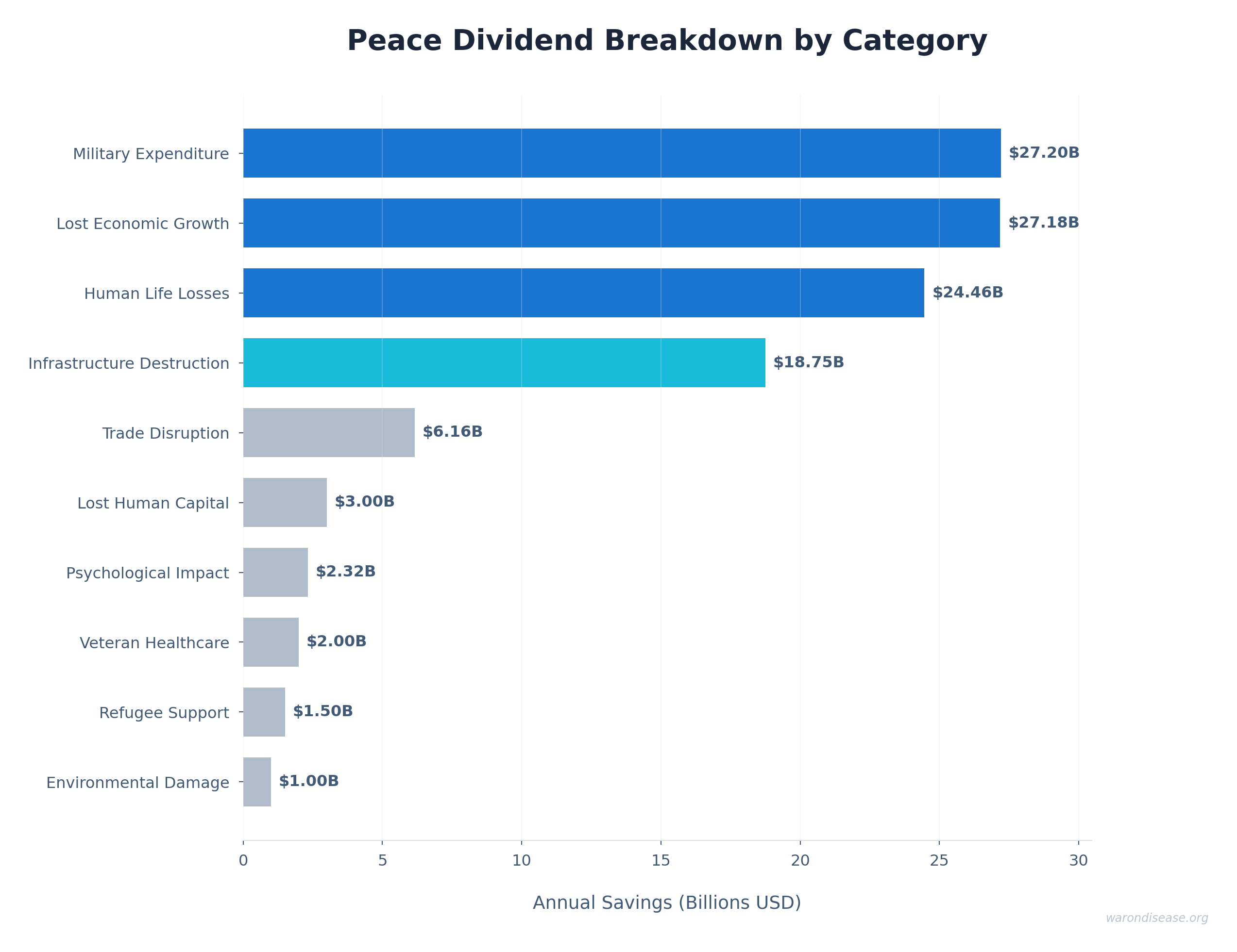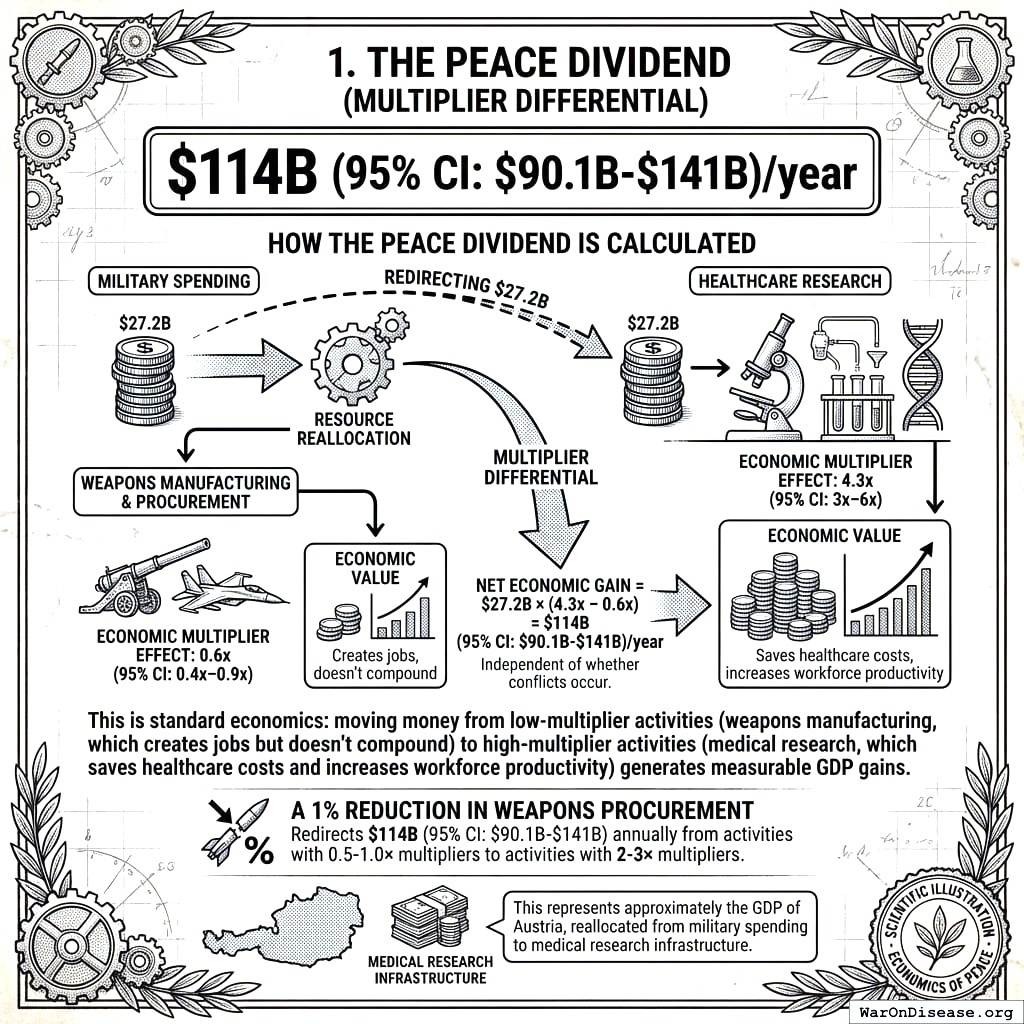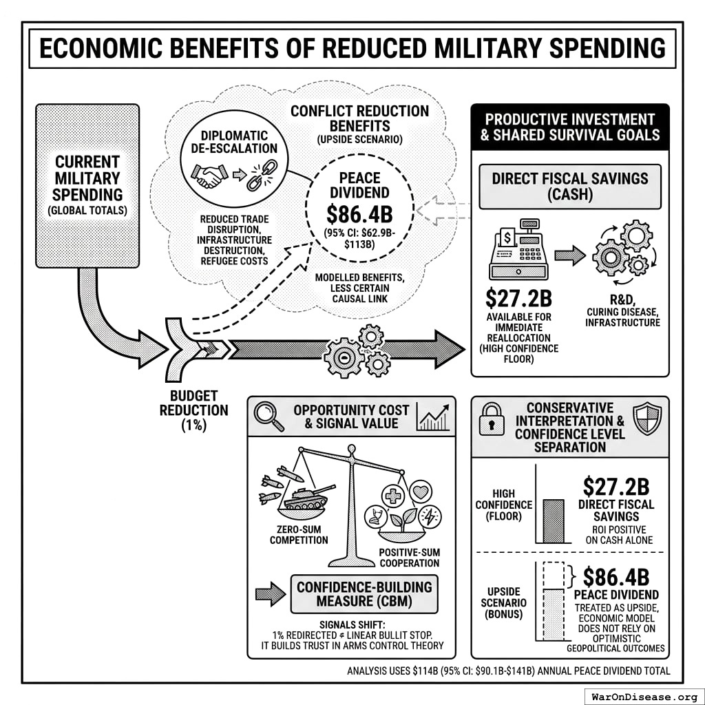 Strategic perspective: A nation’s long-term security depends more on economic strength and healthy populations than on marginal weapons systems. Redirecting 1% from the $2.72T global military budget doesn’t compromise military (99% remains) but generates $172B (95% CI: $140B-$213B) in annual economic benefits.