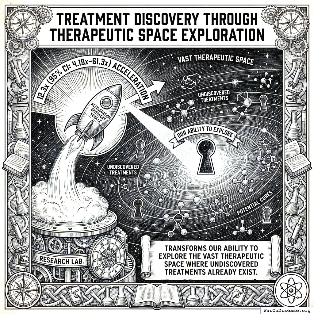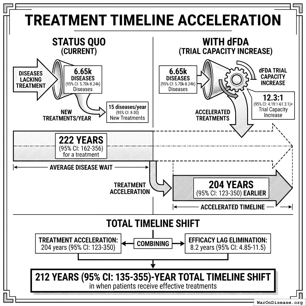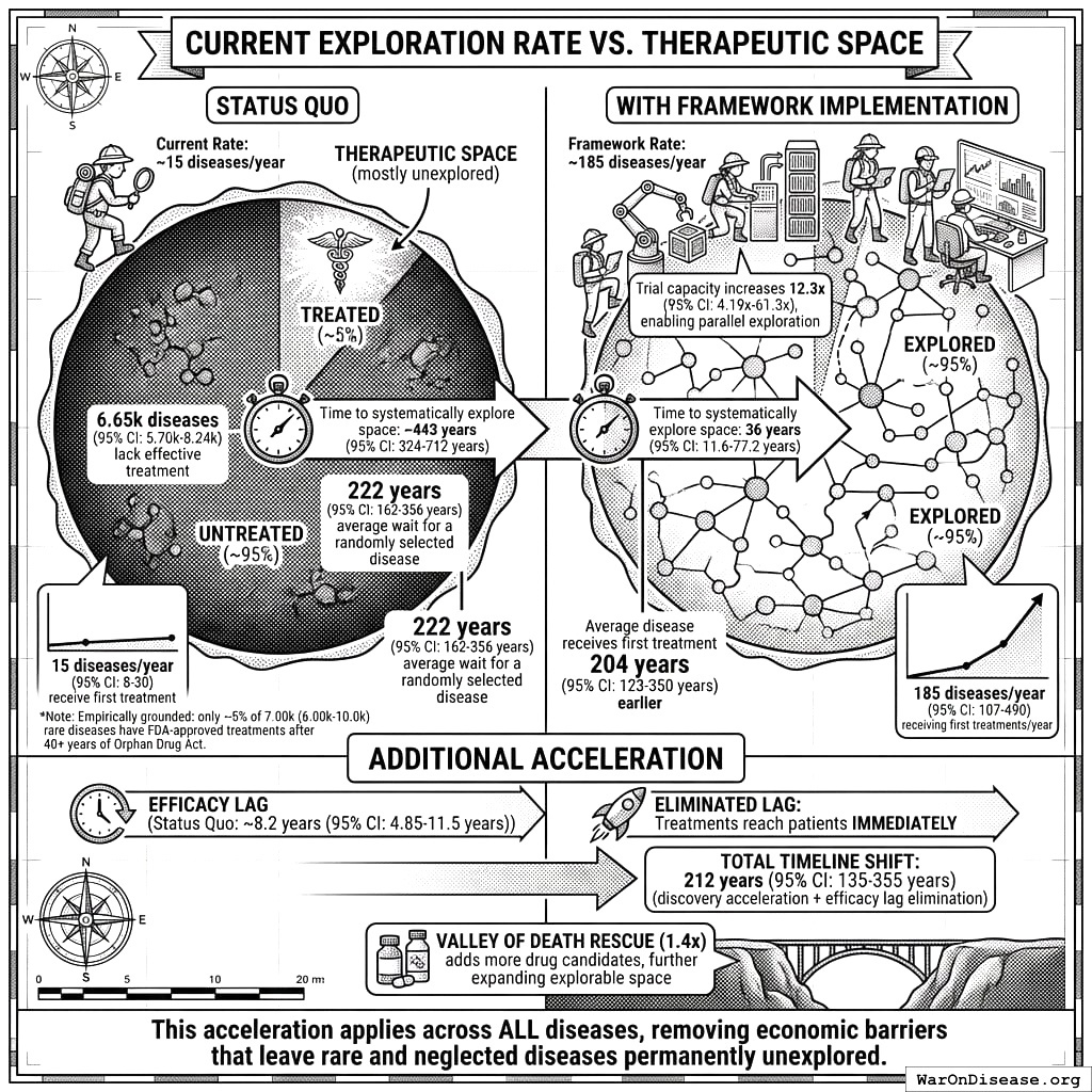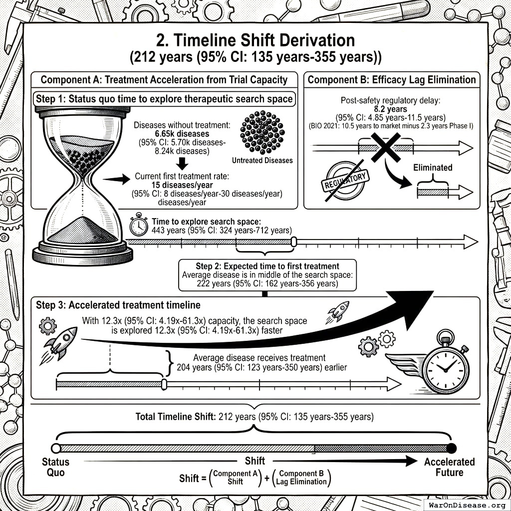 Interpreting the 212 years (95% CI: 135 years-355 years) Timeline Figure: This is a discovery capacity model result, not “time travel” or a prediction that we will achieve results centuries from now. If we must test 9.5 million combinations drug-disease combinations to find all effective treatments, the current system (15 diseases/year (95% CI: 8 diseases/year-30 diseases/year) treatments/year) would take ~443 years (95% CI: 324 years-712 years) to explore this therapeutic search space. Scaling capacity 12.3x (95% CI: 4.2x-61.4x) reduces exploration time to ~36 years (95% CI: 11.6 years-77.1 years). The “212 years (95% CI: 135 years-355 years)” represents the average time a treatment that could be discovered today would have waited under the old system versus the new system. Treatments discovered sooner save lives during the intervening period; this cumulative benefit over the acceleration period yields the headline mortality and economic figures.