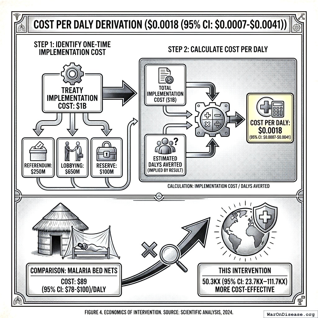 Cost-effectiveness: $0.00177 (95% CI: $0.000715-$0.00412)/DALY via treaty advocacy (50.3kx (95% CI: 23.8kx-111.7kx) better than bed nets) or $0.842 (95% CI: $0.242-$1.75)/DALY via direct funding. ROI ranges from 637 (95% CI: 569-790):1 (R&D savings only) to 84.8M (95% CI: 46.6M-144M):1 (complete benefits). This qualifies as cost-saving: it reduces costs while improving outcomes.