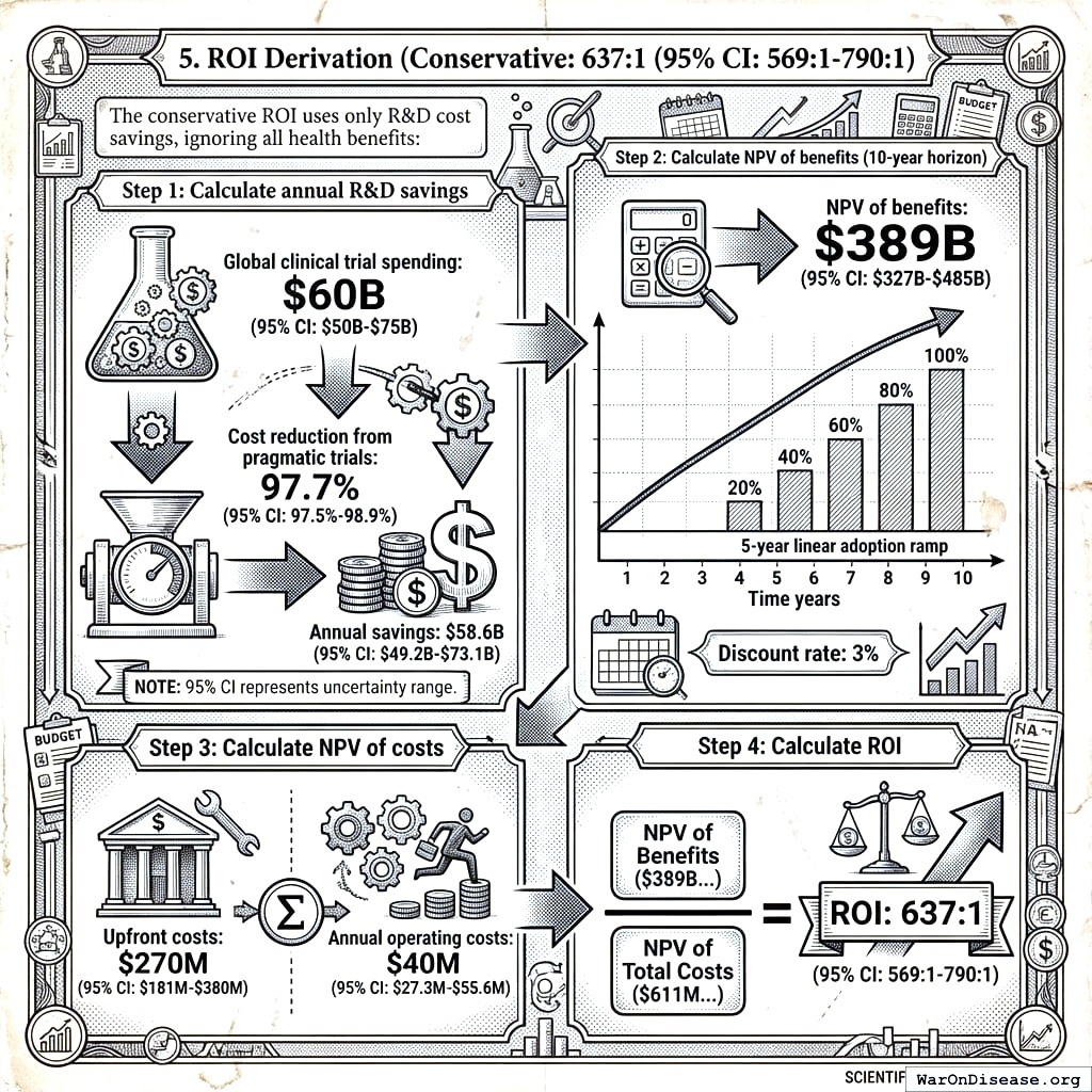 Redirecting 1% of global military spending to pragmatic clinical trials delivers 637 (95% CI: 569-790):1 to 84.8M (95% CI: 46.6M-144M):1 ROI using standard health economics methodology (NPV, QALYs, ICER). The intervention qualifies as cost-saving and requires no new taxes, only reallocation of existing budgets to higher-ROI activities.