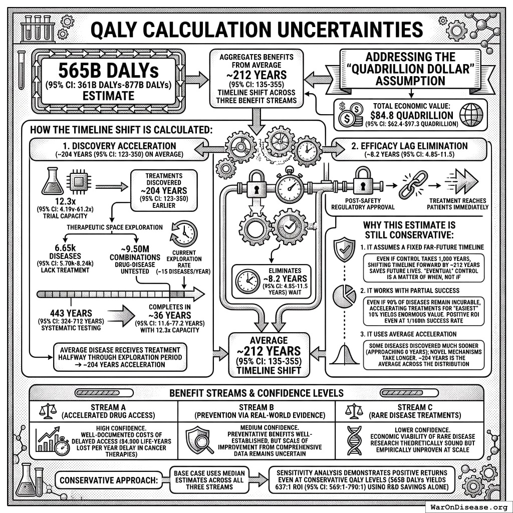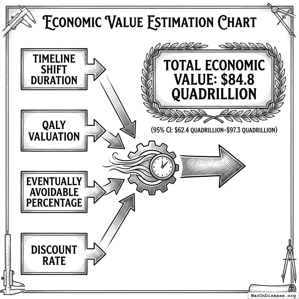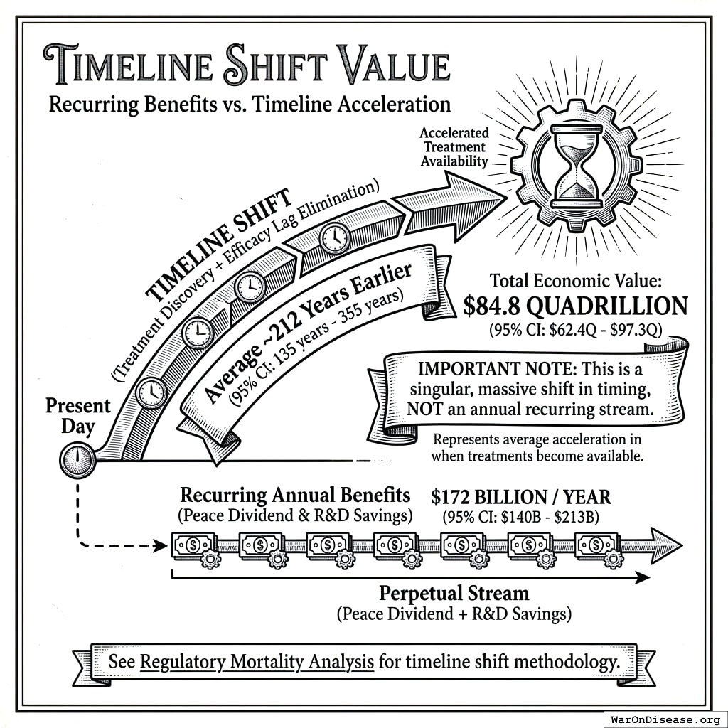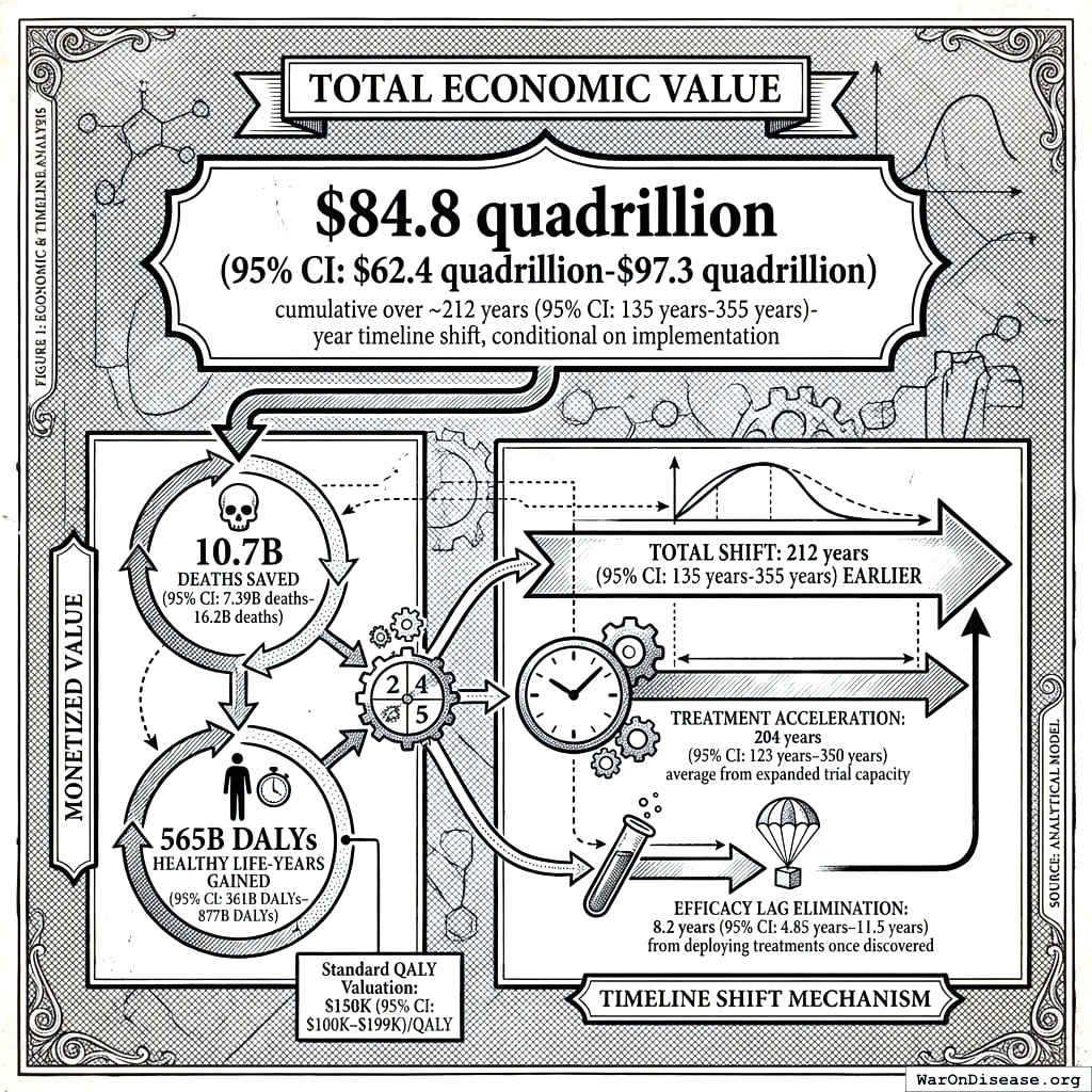 Important limitations: (1) Economic value estimates are cumulative over the ~212 years (95% CI: 135 years-355 years) timeline shift, not annual values. (2) All estimates are conditional on successful treaty implementation. (3) Phase I safety testing remains mandatory. What changes is eliminating post-safety efficacy delays. (4) The “quadrillion dollar” figures represent monetized value of lives saved over centuries of accelerated medical progress, using standard QALY methodology.
