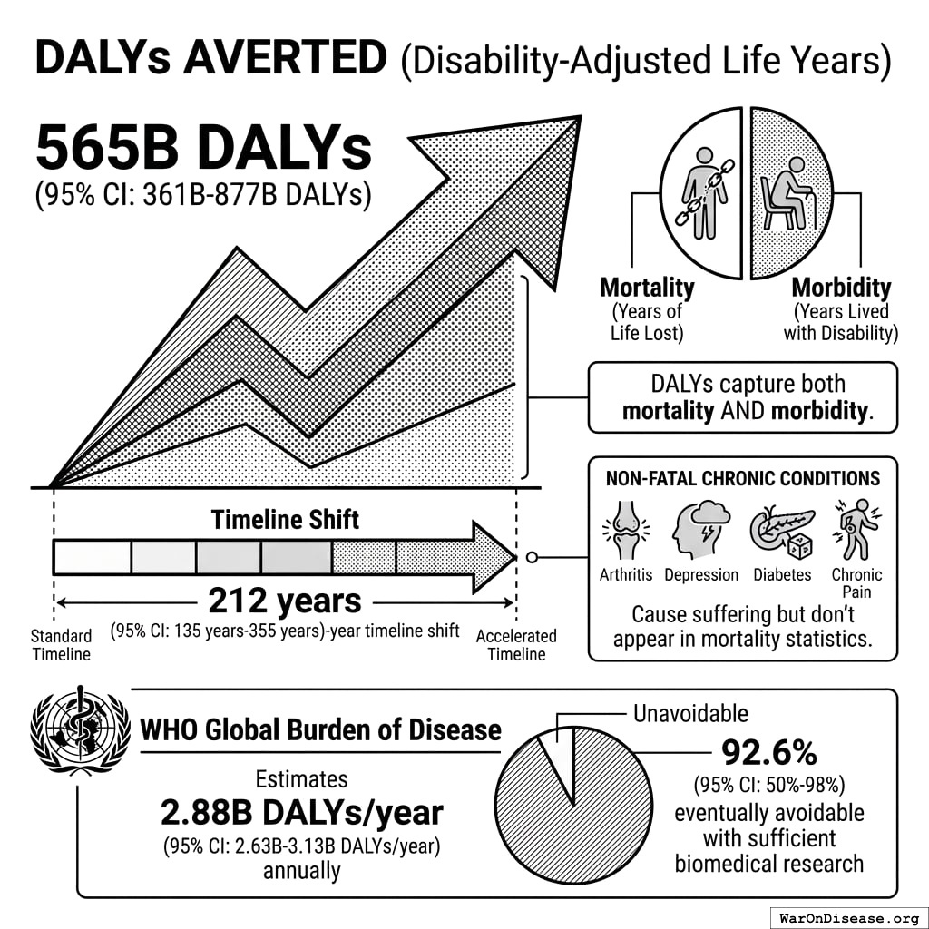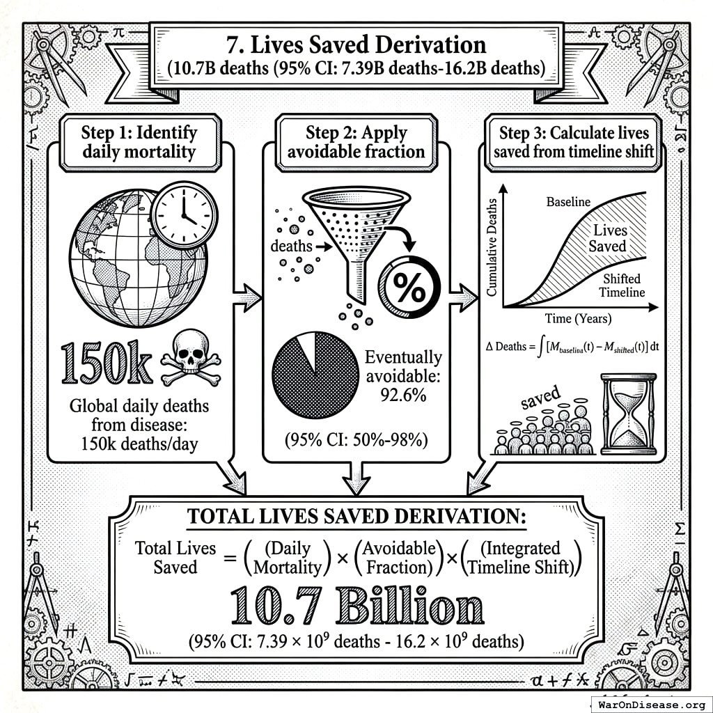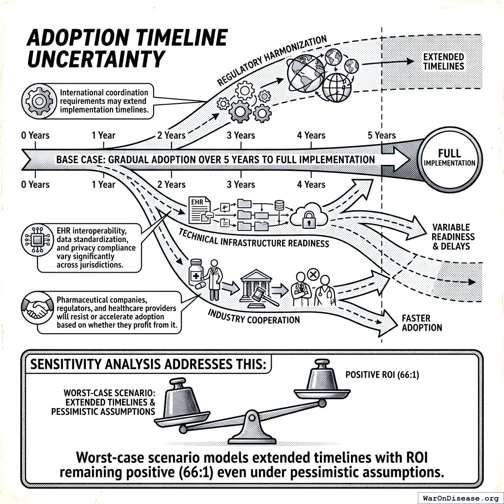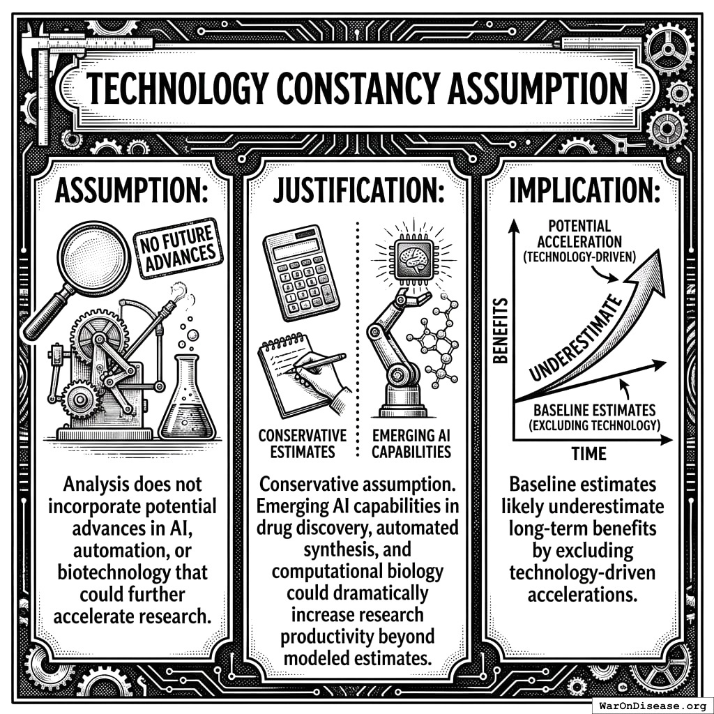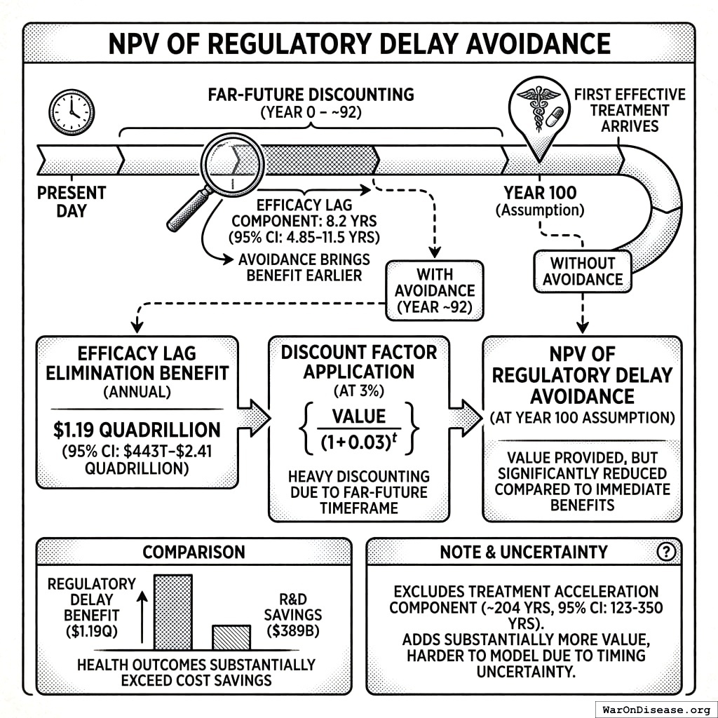 Important limitations: (1) Economic value estimates are cumulative over the ~212 years (95% CI: 135 years-355 years) timeline shift, not annual values. (2) All estimates are conditional on successful treaty implementation. (3) Phase I safety testing remains mandatory. What changes is eliminating post-safety efficacy delays. (4) The “quadrillion dollar” figures represent monetized value of lives saved over centuries of accelerated medical progress, using standard QALY methodology.