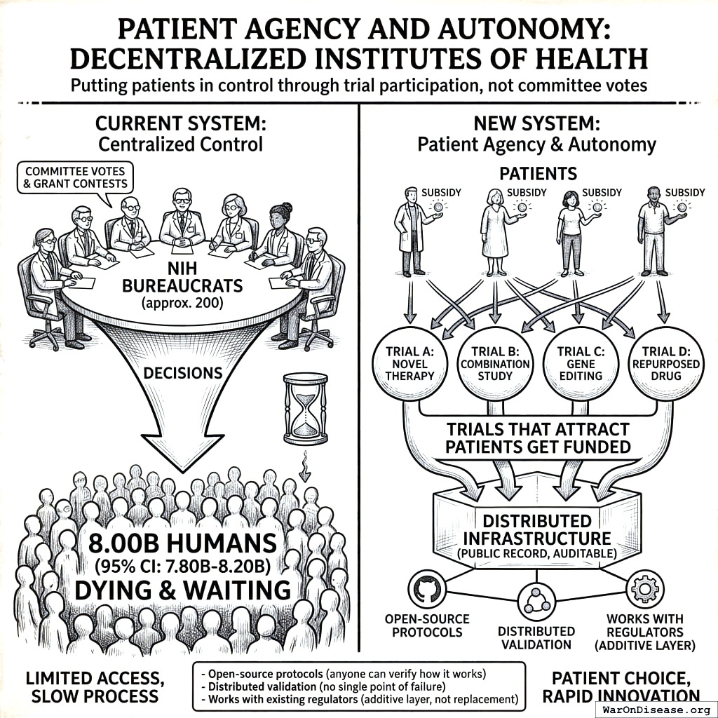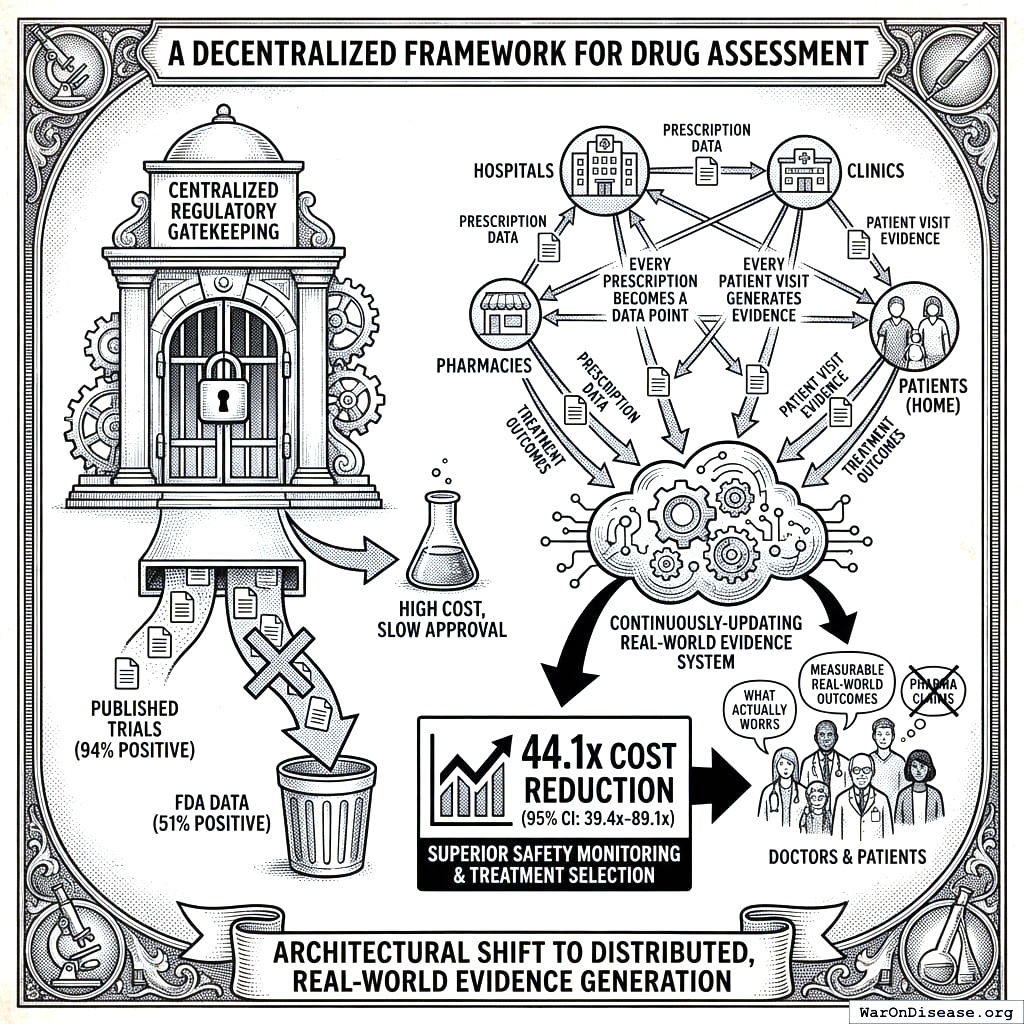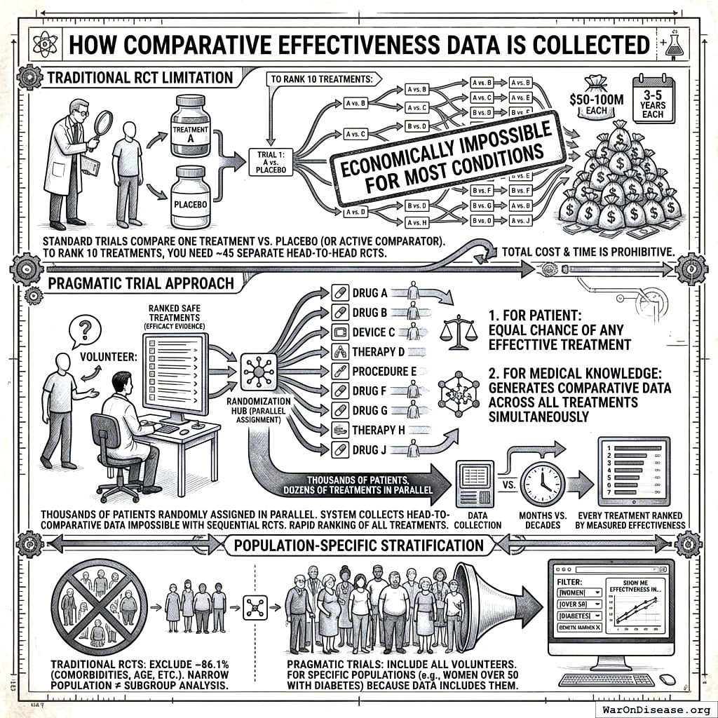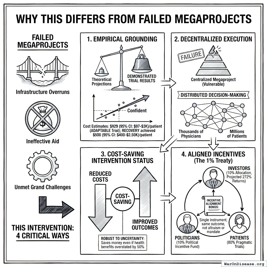 2. Decentralized execution: Unlike centralized megaprojects vulnerable to corruption and bureaucratic failure, pragmatic trials distribute decision-making across thousands of physicians and millions of patients. No single point of failure.
