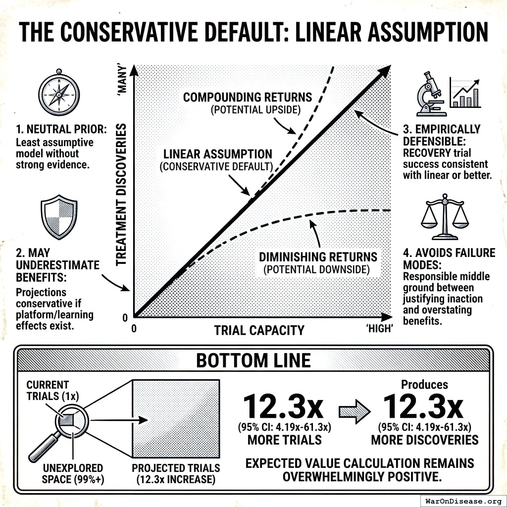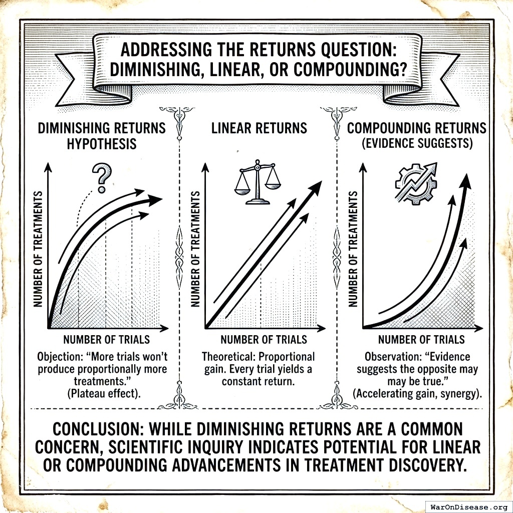 4. Quality versus quantity trade-off: 12.3x (95% CI: 4.2x-61.4x) more trials may not yield proportional breakthroughs if resources spread thin or trial quality declines. The analysis assumes quality maintenance through peer review and replication; actual quality effects remain uncertain.