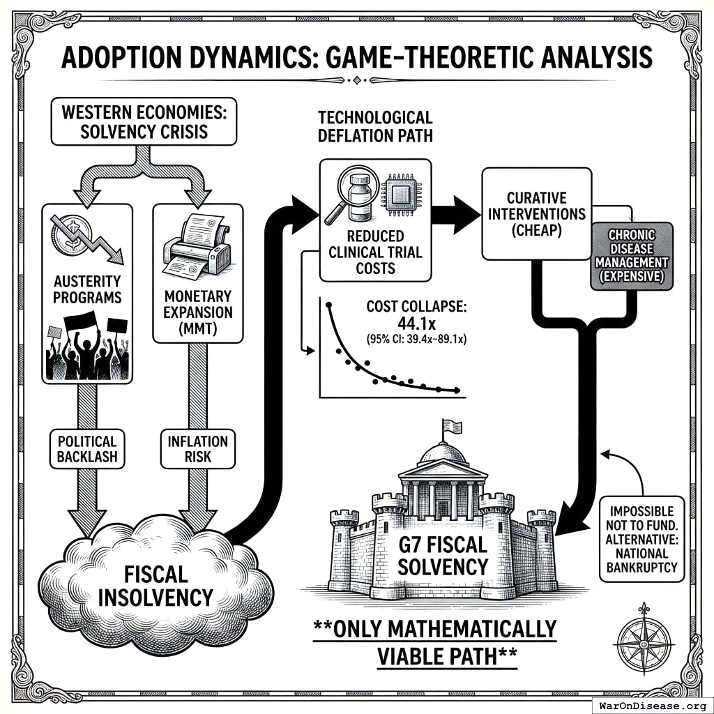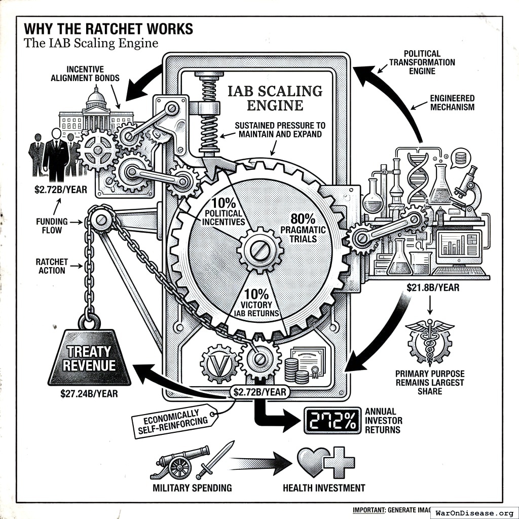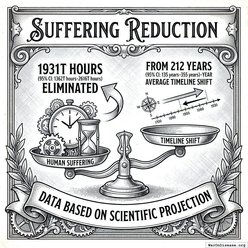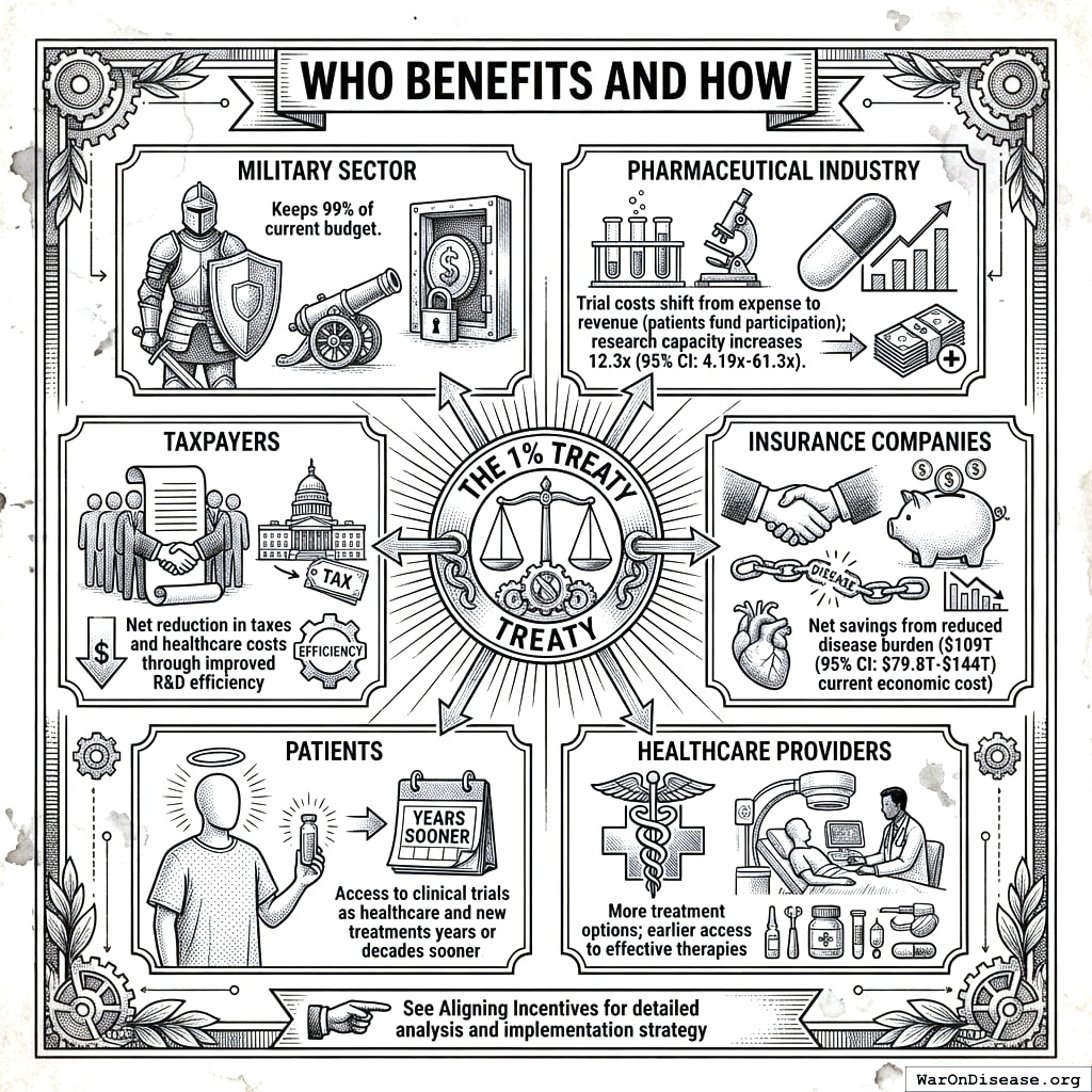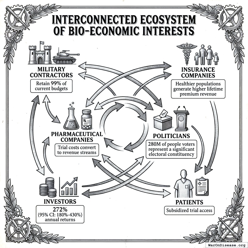 This creates a self-sustaining funding mechanism where: 1. Investors profit from peace dividend returns 2. Politicians profit from voter support and campaign funding 3. Pharma companies profit from massively reduced R&D costs 4. Patients benefit from 8.2 years (95% CI: 4.85 years-11.5 years) faster access to treatments 5. Governments benefit from healthier, more productive populations