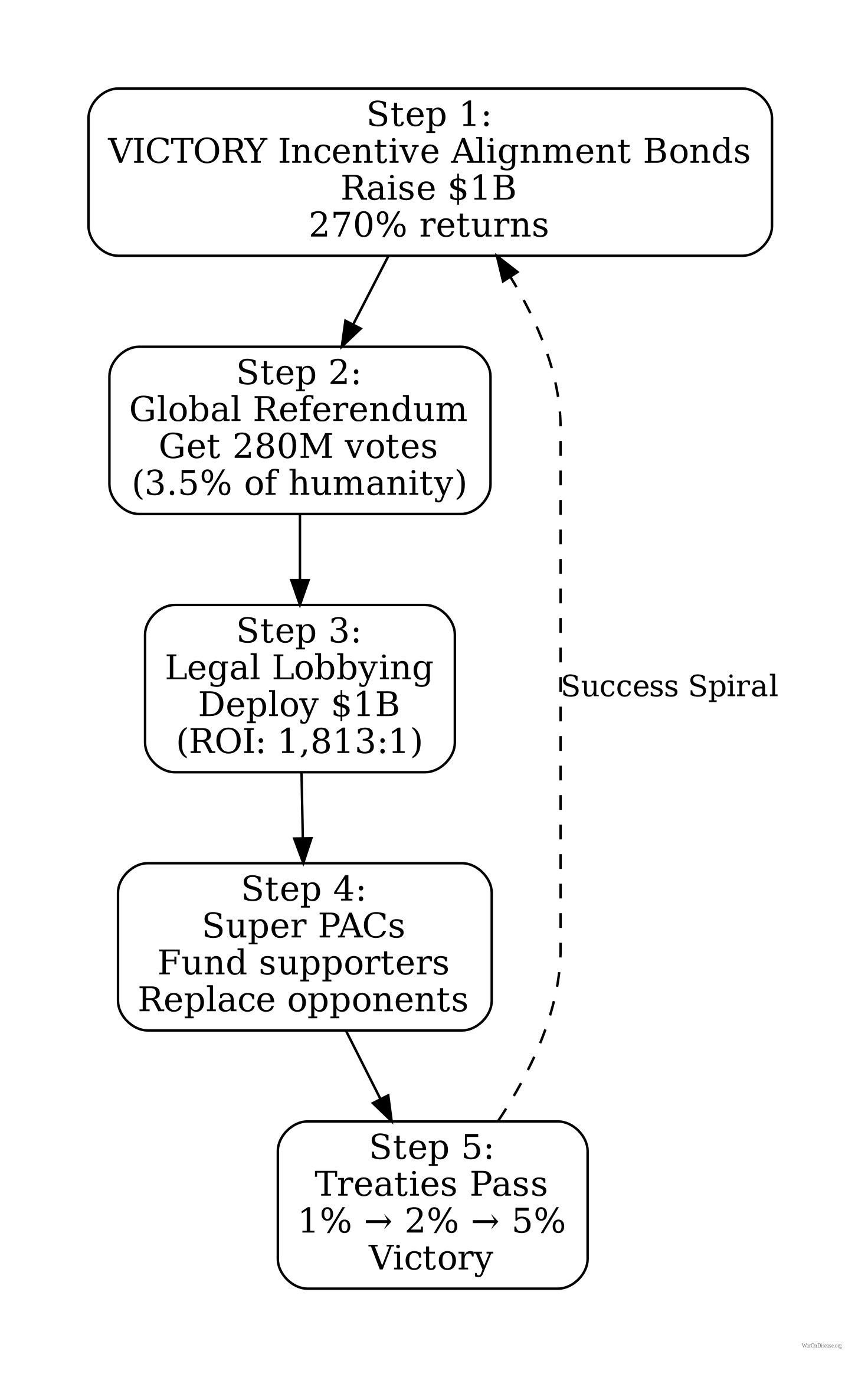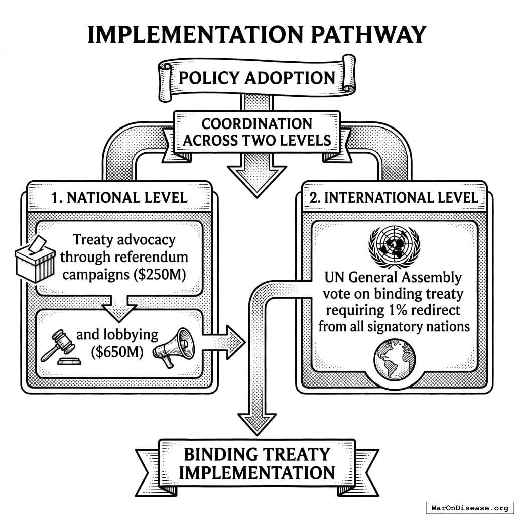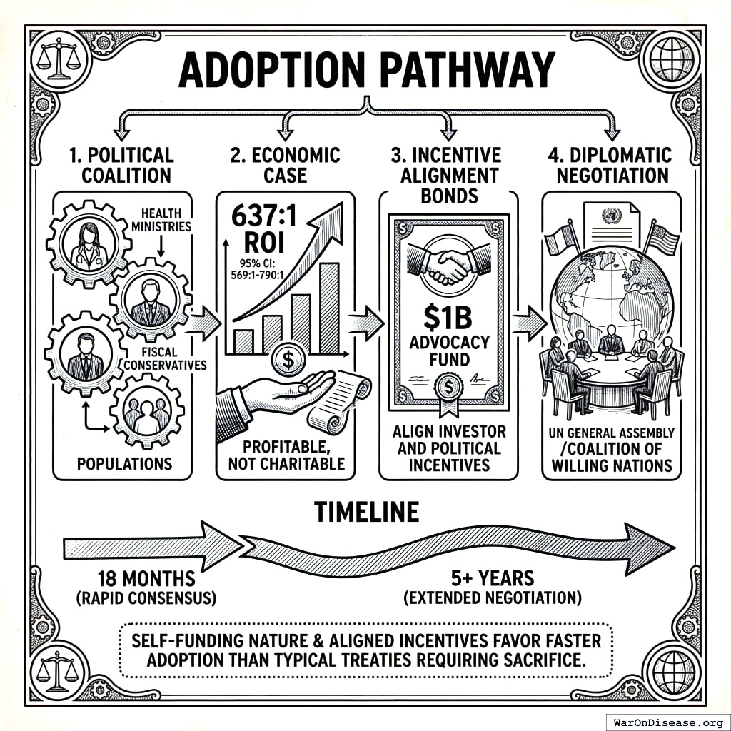 Treaty adoption depends on: 1. Political coalition: Build support among health ministries, fiscal conservatives seeking budget efficiency, and populations demanding better healthcare 2. Economic case: 637 (95% CI: 569-790):1 ROI makes this profitable, not charitable 3. Incentive Alignment Bonds: Fund $1B advocacy phase, align investor and political incentives 4. Diplomatic negotiation: UN General Assembly or coalition of willing nations