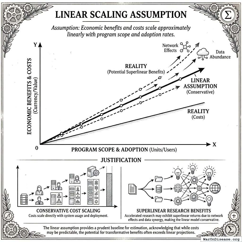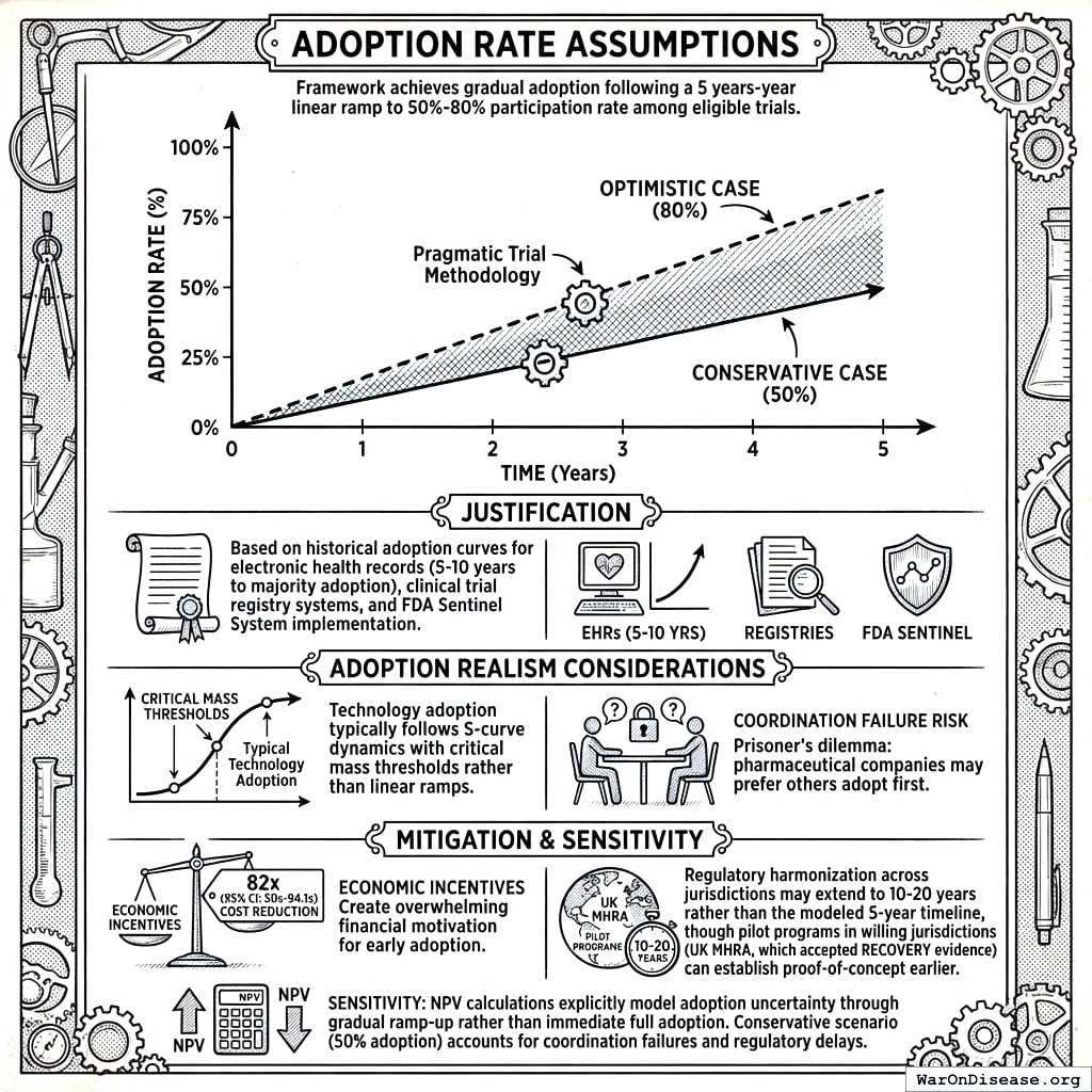 3. Crowding out effects: Do billions in new pragmatic clinical trials displace existing research funding, or does it add incrementally? Conservative assumption: fully additive. If partially substitutive (e.g., governments reduce NIH funding in response), net research increase would be lower than modeled.