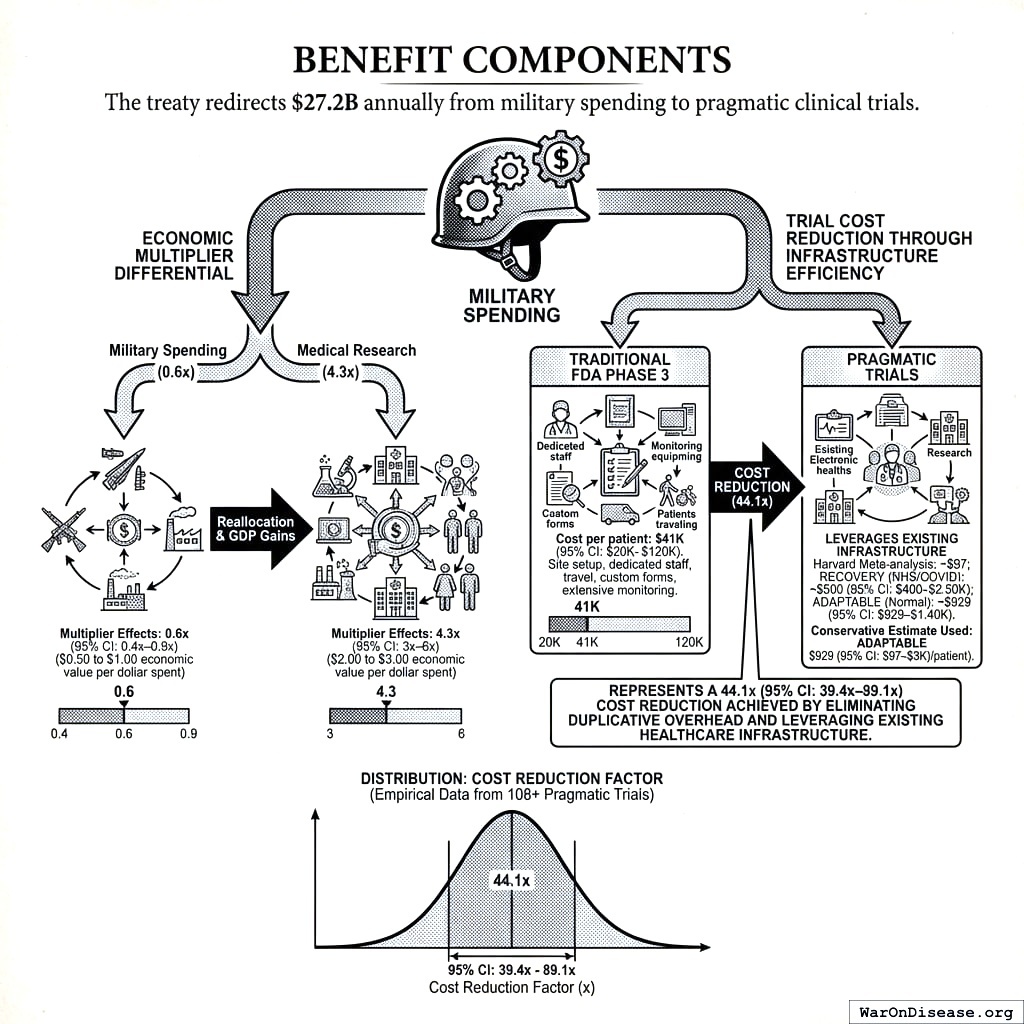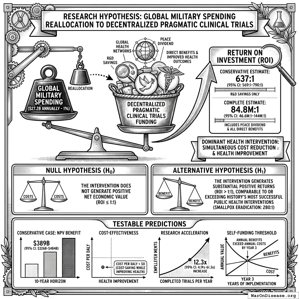 Primary Hypothesis: Reallocating 1% of global military spending ($27.2B annually) to fund decentralized pragmatic clinical trials generates return on investment between 637 (95% CI: 569-790):1 (conservative estimate, R&D savings only) and 84.8M (95% CI: 46.6M-144M):1 (complete estimate, including peace dividend and all direct benefits), representing a dominant health intervention that simultaneously reduces costs while improving health outcomes.