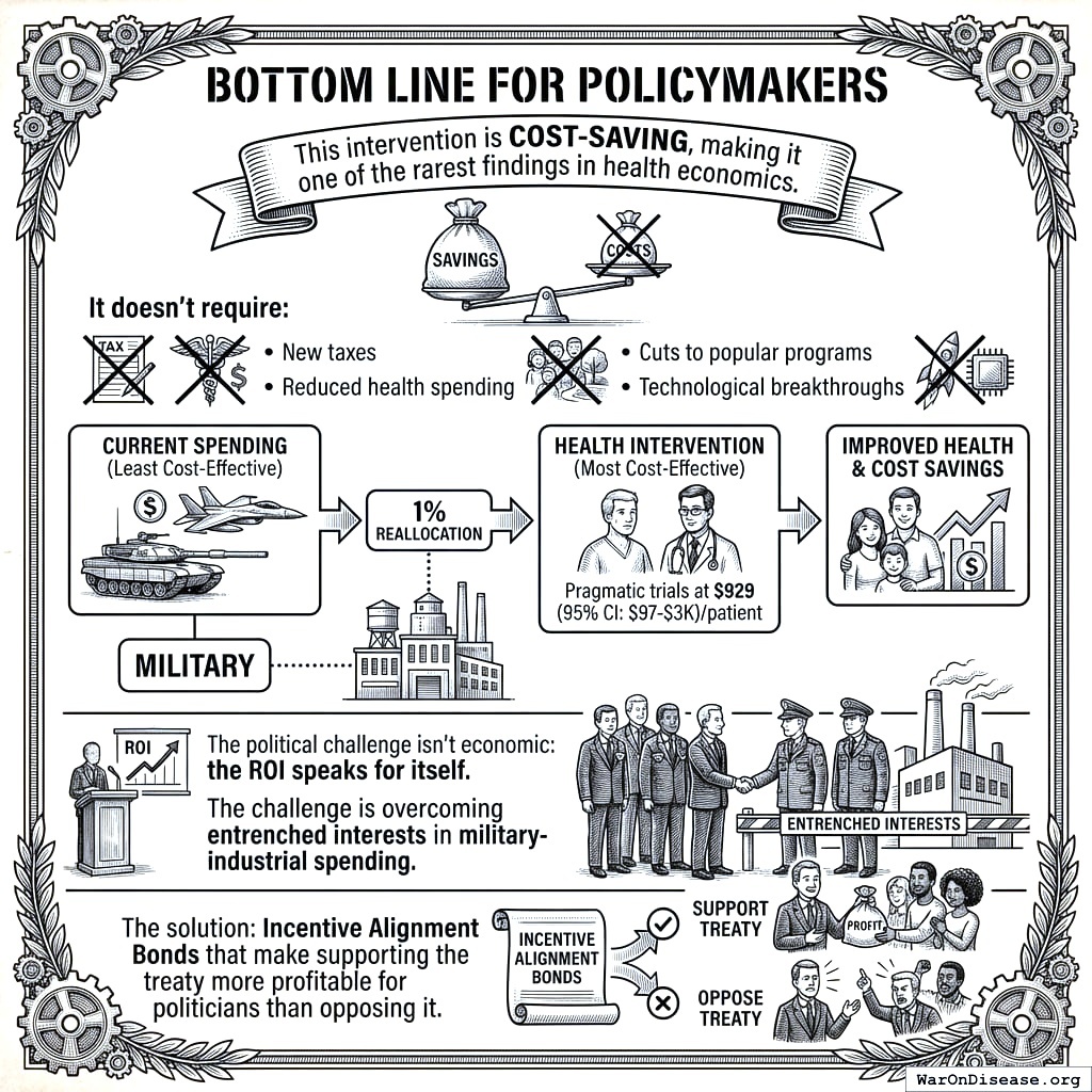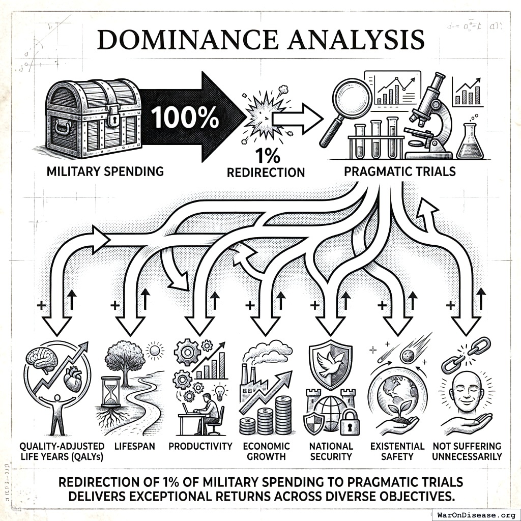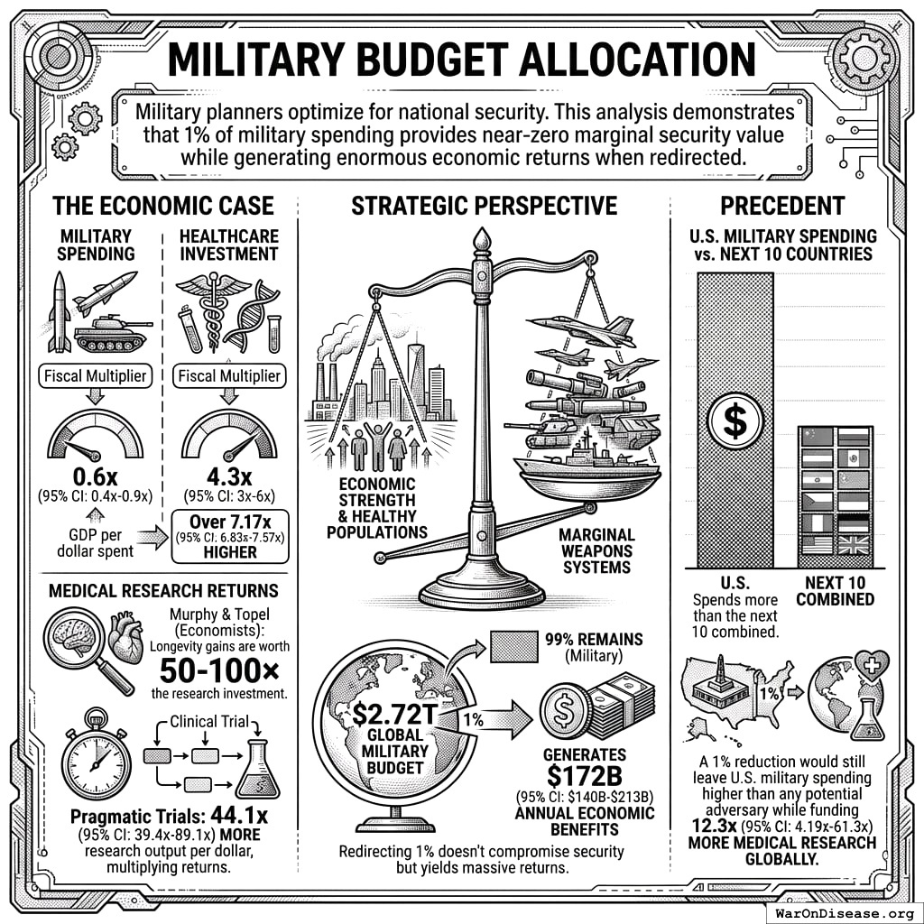 Implications: This intervention corrects a fundamental capital misallocation: military spending creates depreciating assets (weapons become obsolete), while medical research creates appreciating assets (treatments compound in value). Comparable to smallpox eradication (280:1 ROI), it represents the highest-ROI reallocation available to policymakers.