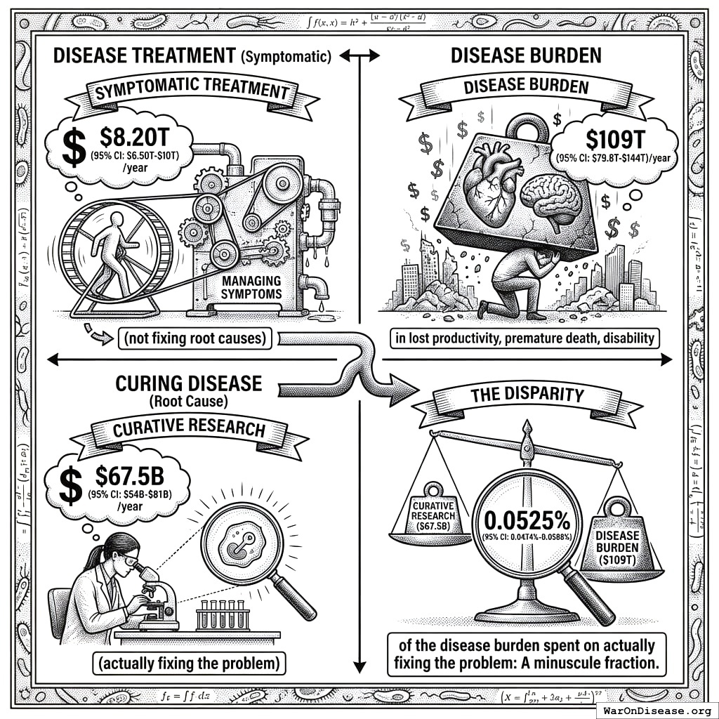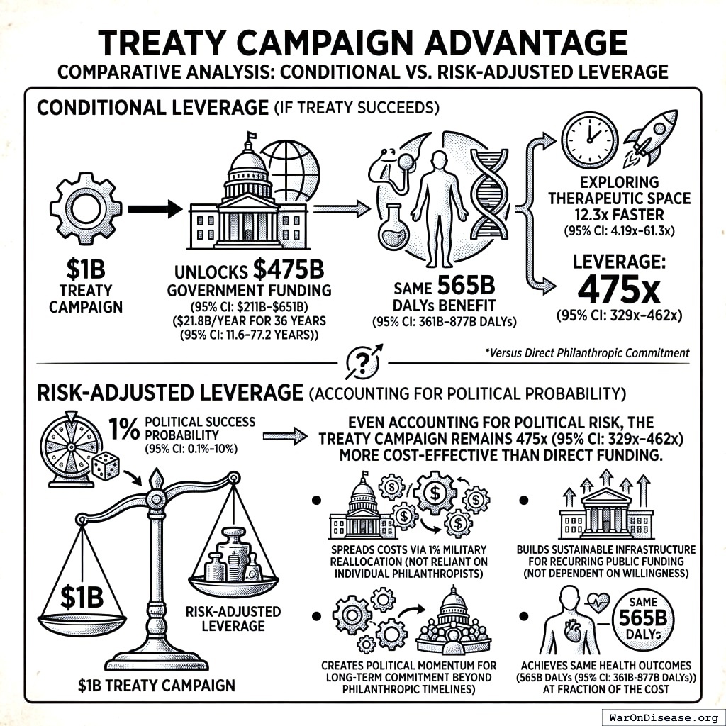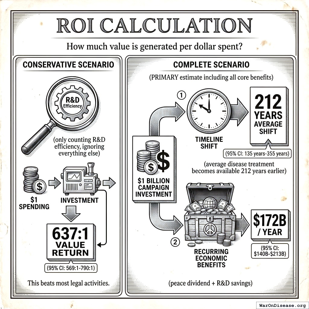 Implications: This intervention corrects a fundamental capital misallocation: military spending creates depreciating assets (weapons become obsolete), while medical research creates appreciating assets (treatments compound in value). Comparable to smallpox eradication (280:1 ROI), it represents the highest-ROI reallocation available to policymakers.