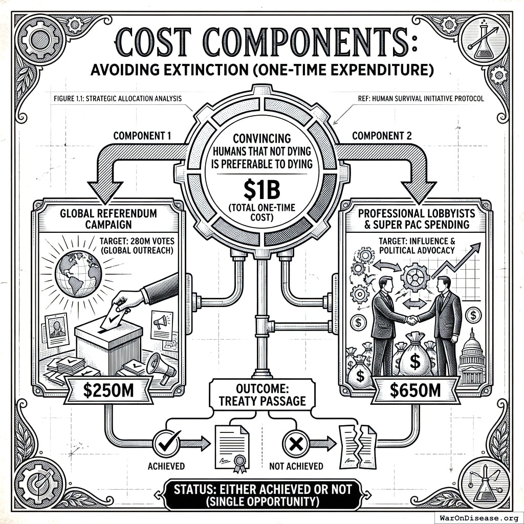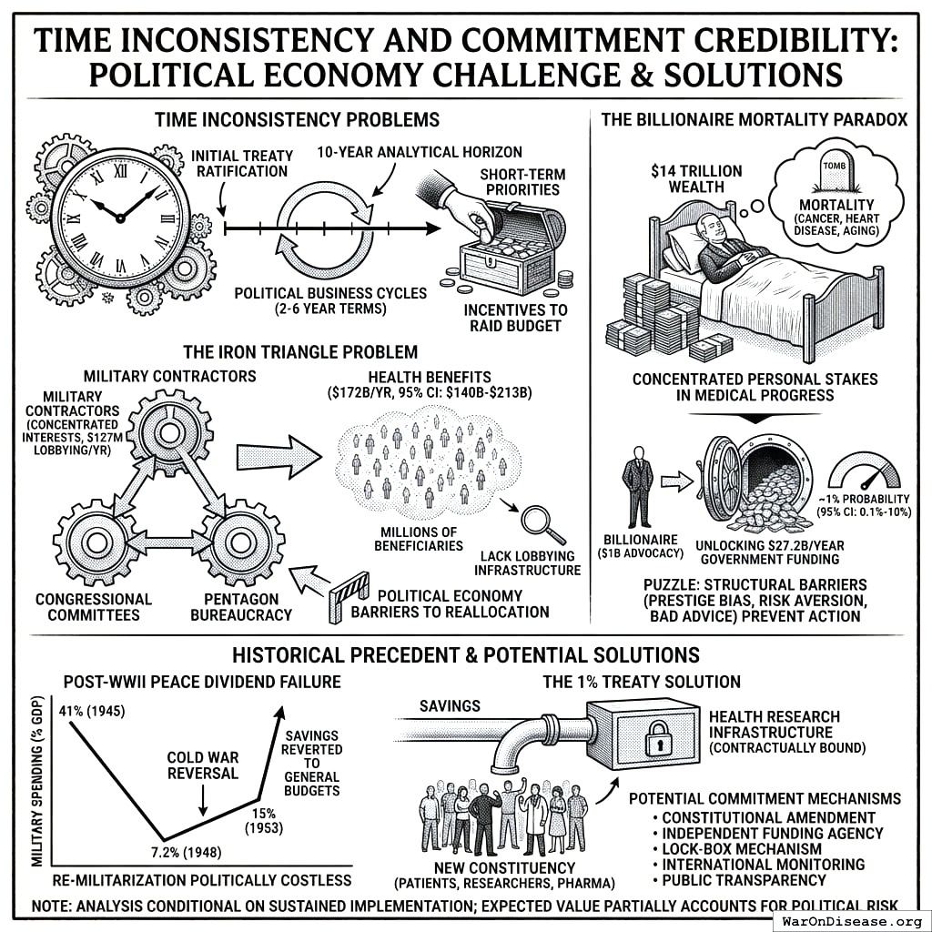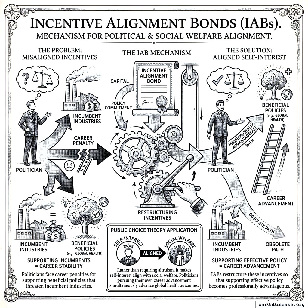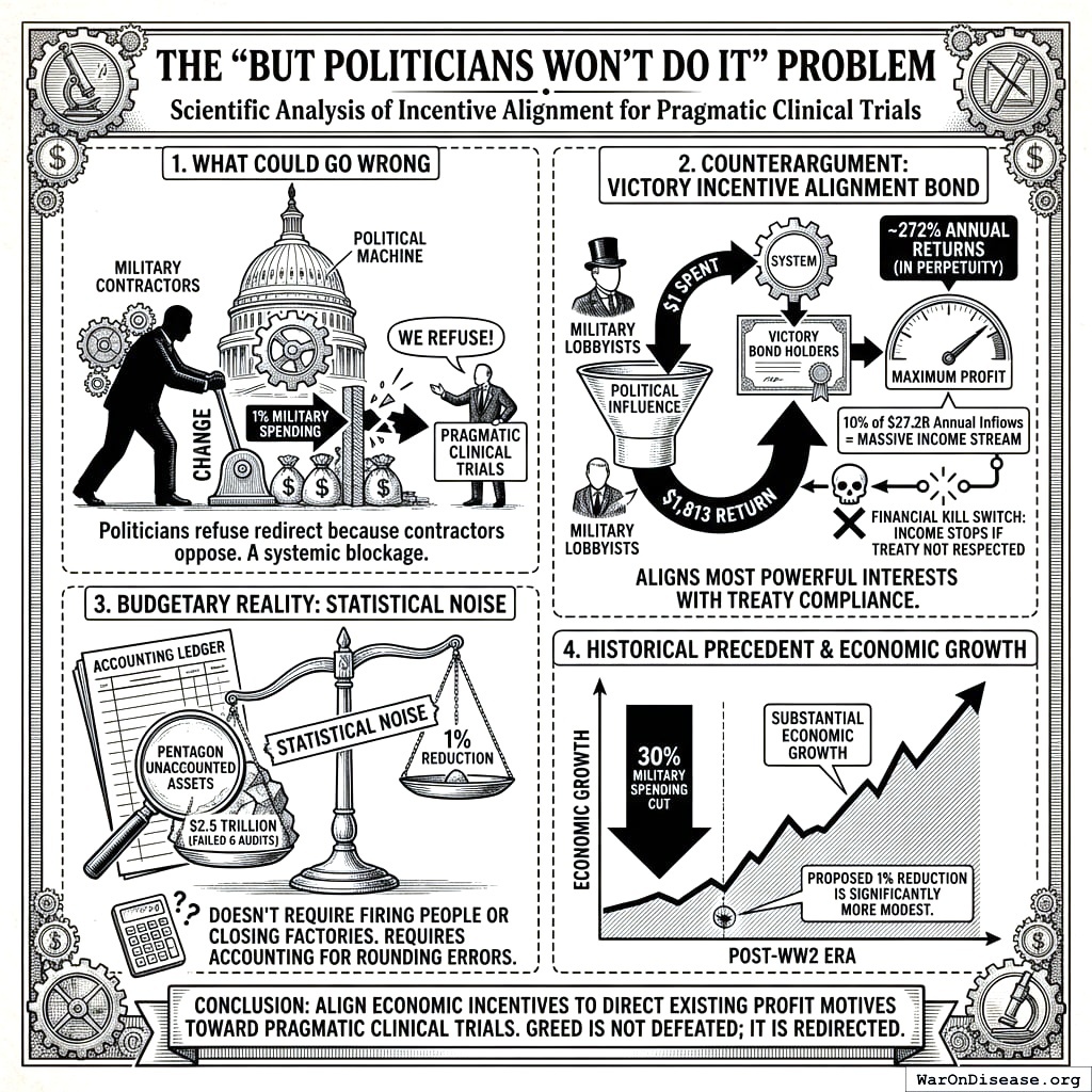 The political challenge isn’t economic: the ROI speaks for itself. The challenge is overcoming entrenched interests in military-industrial spending. The solution: Incentive Alignment Bonds that make supporting the treaty more profitable for politicians than opposing it.